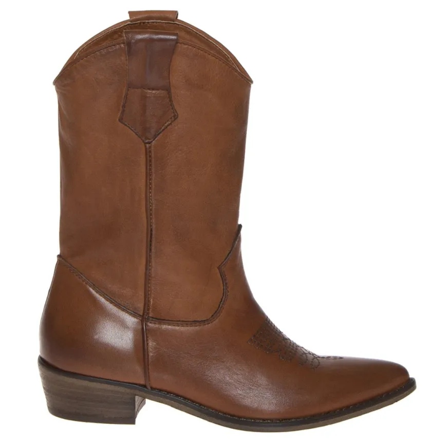 Stivale-tronchetto texano donna, in morbida pelle marrone cuoio sfumata, di THE FLOW. Internamente sottopiede rivestito in pelle, chiusura infilata. Caratteristica inpuntura camperos disegnata sul puntale. Suola in cuoio, tacco smussato altezza 4 cm. Altezza del gambale 25 cm misurato nella taglia 37, l’effetto morbido della pelle permette di portarlo in maniera e con effetto rigonfiato. Calzatura ideata, disegnata e realizzata in Italia, prodotto made in Italy.