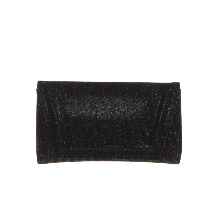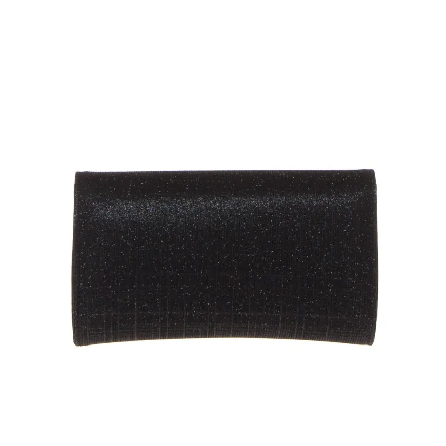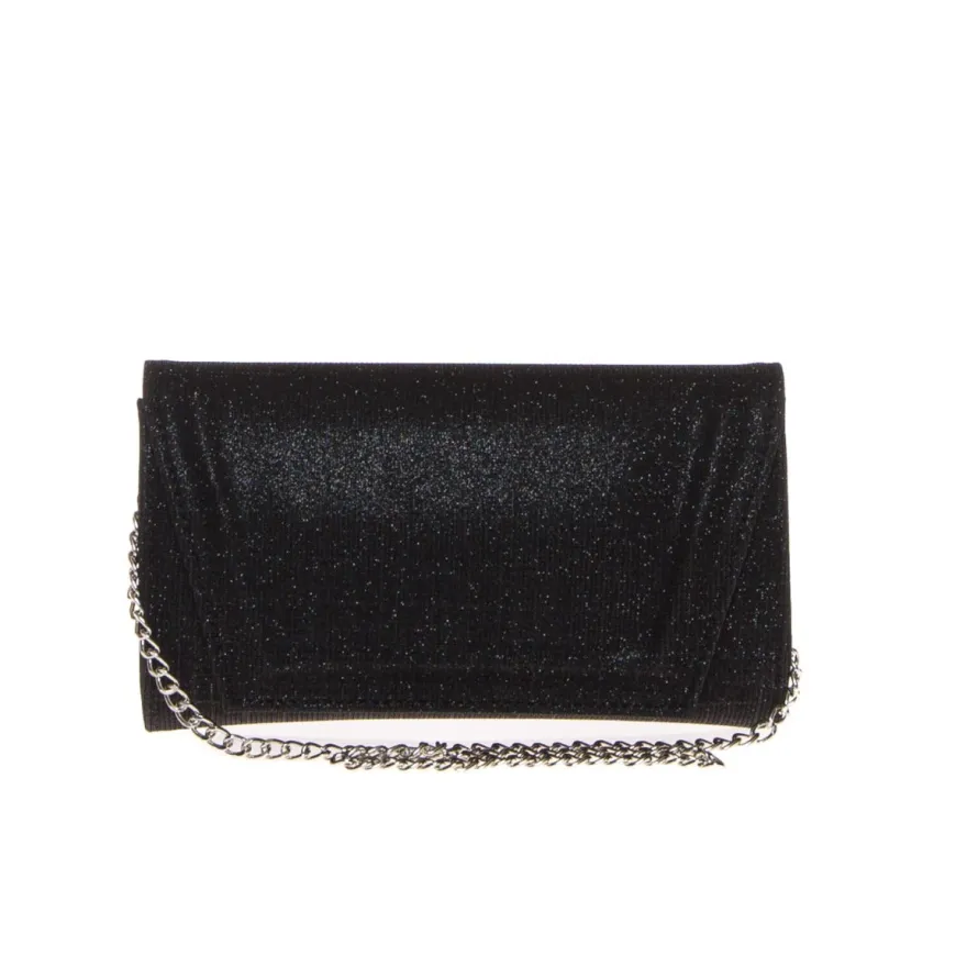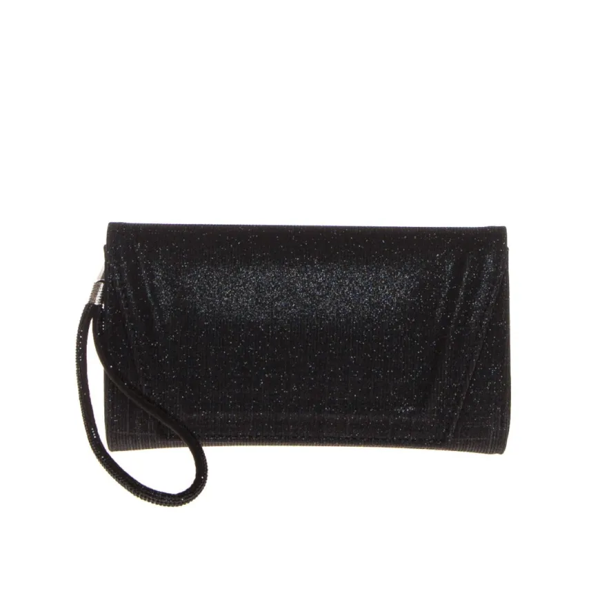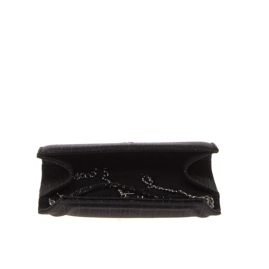 Pochette elegante da donna di ALBANO realizzata in tessuto lurex nero con cinturino gioiello da polso impreziosito da strass. Catenella in metallo. Chiusura con pattina e bottone magnetico.