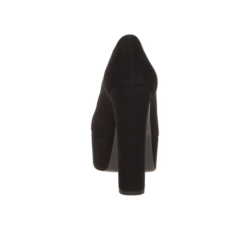 Decollette donna plaform e tacco largo di ALESSANDRA PELUSO. Esternamente in pelle scamosciata nero, rivestito anche nel tacco e platform. Internamente e nel morbido sottopiede, in pelle. Platform altezza 4 cm, tacco 13.5 cm. Prodotto full Made in Italy.