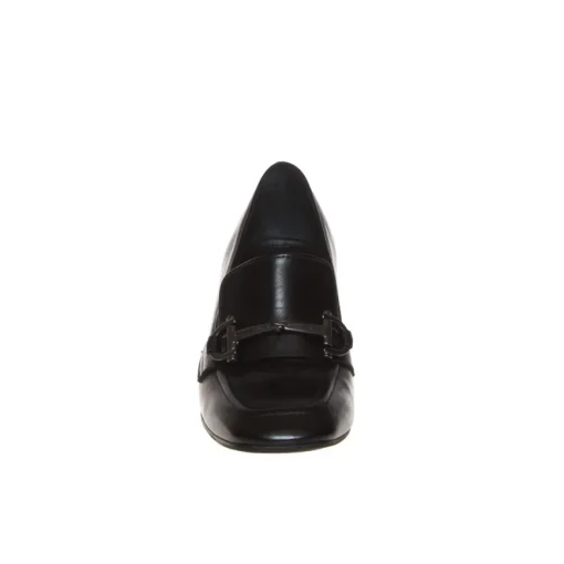 Mocassino donna elegante di ALESSANDRA PELUSO. Tomaia realizzata in pelle nappa nera con morsetto metallico. Morbido sottopiede interno foderato in pelle. Suola in cuoio con antiscivolo in gomma, tacco largo di 6 cm altezza. Lavorazione artigianale made in Italy