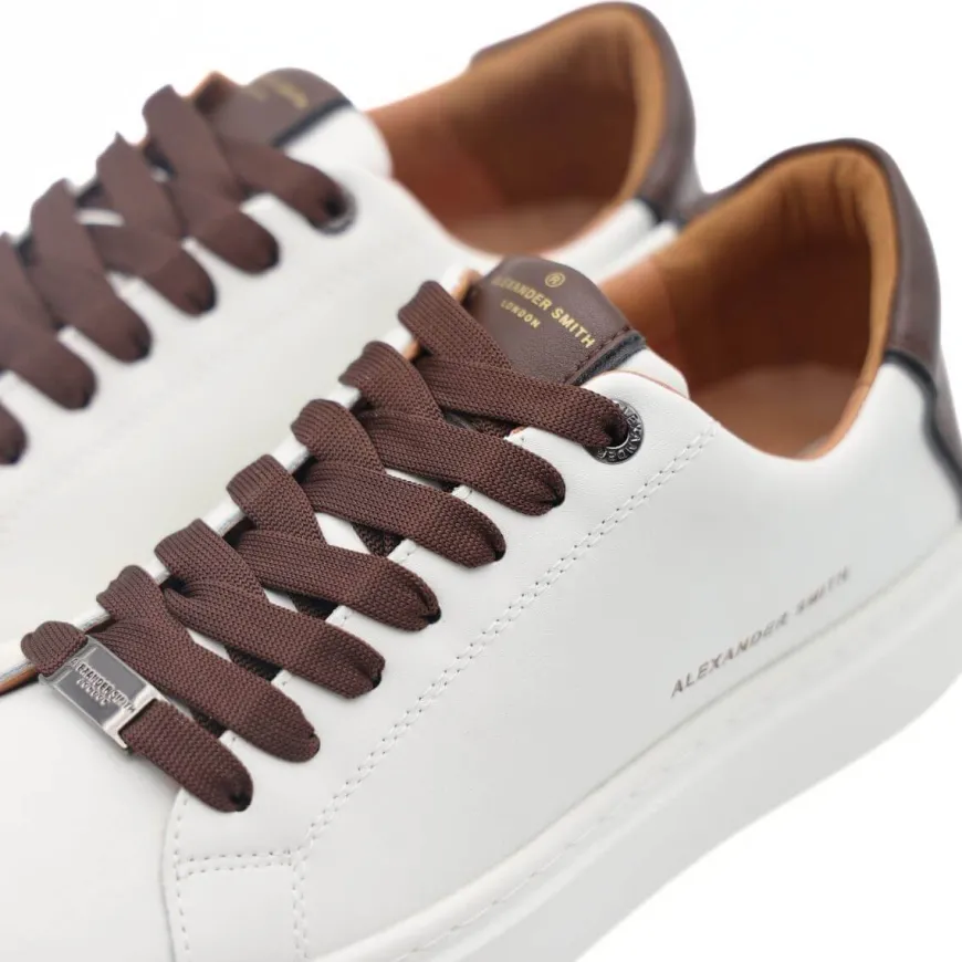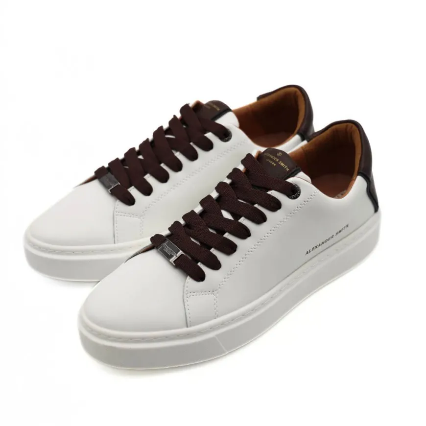 Sneakers di ALEXANDER SMITH , semplice e minimalista ma allo stesso tempo in grado di racchiudere il carisma dell’intera azienda con pochi semplici dettagli. Questo modello celebra il 10° anniversario della fondazione del brand, e presenta una rivisitazione del logo che ne sottolinea il carattere e la personalità, in questa variante in pelle bianca con dettagli marrone scuro, e placchetta argento.