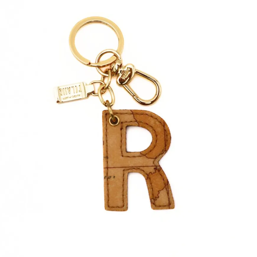 Portachiavi da donna, lettera R, tessuto stampato Geo Classic e pelle. Occhiello e moschettone dorati. Cuciture in tono.