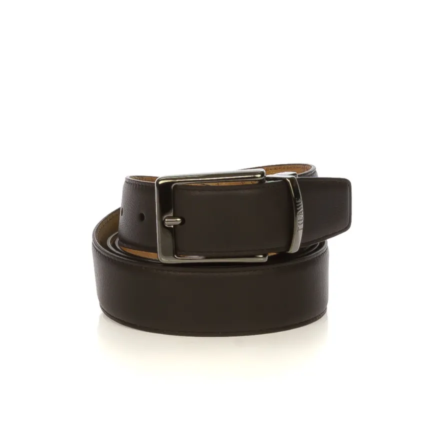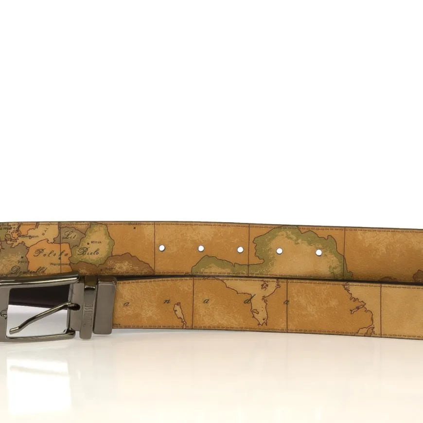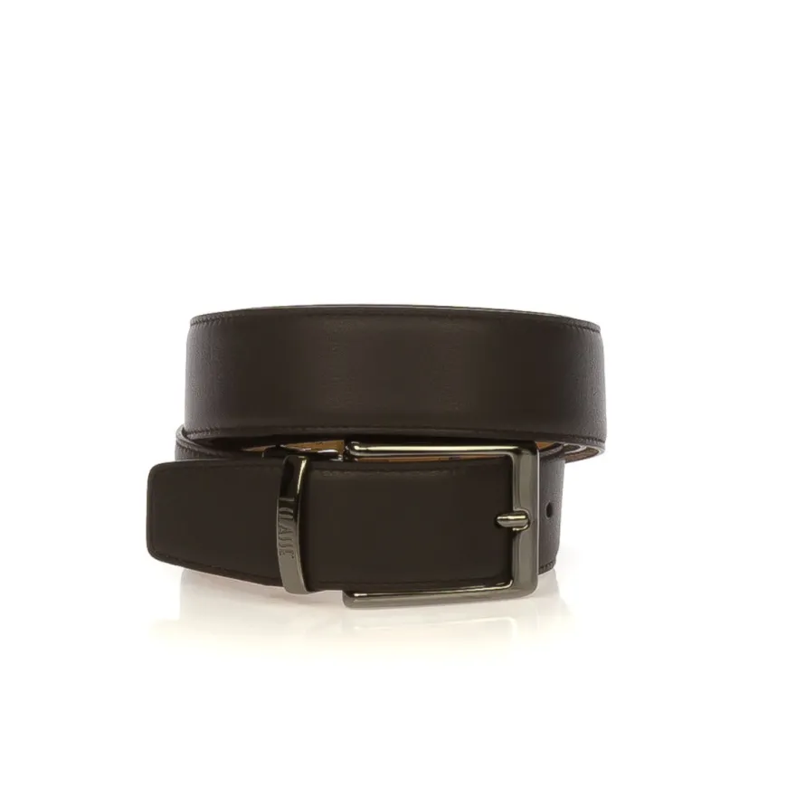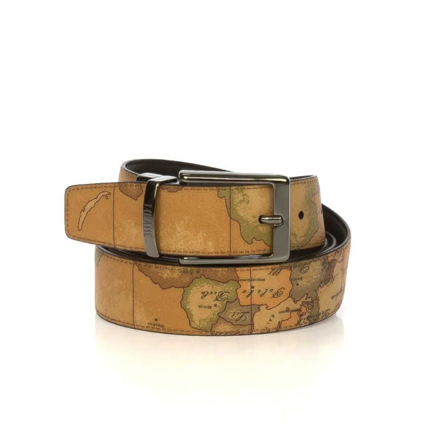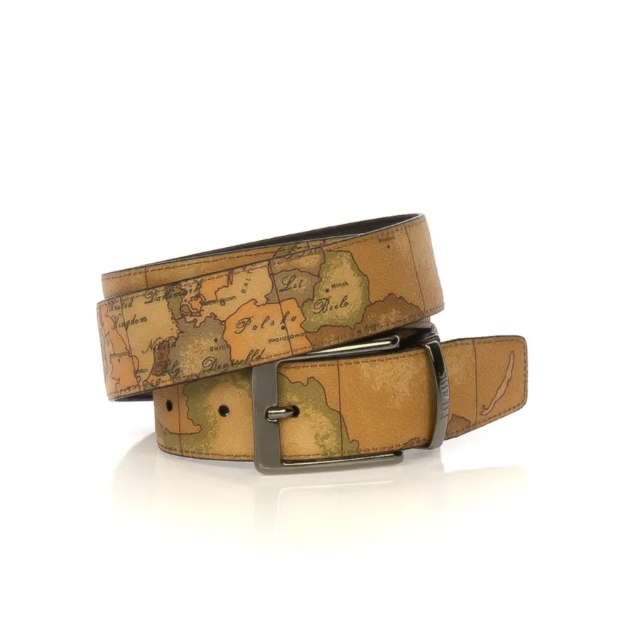Cintura da uomo di ALVIERO MARTINI 1^CLASSE reversibile con fibbia in metallo brunito, realizzata in pelle testa di moro da un lato e in tessuto Geo Classic dall’altro. MADE IN ITALY