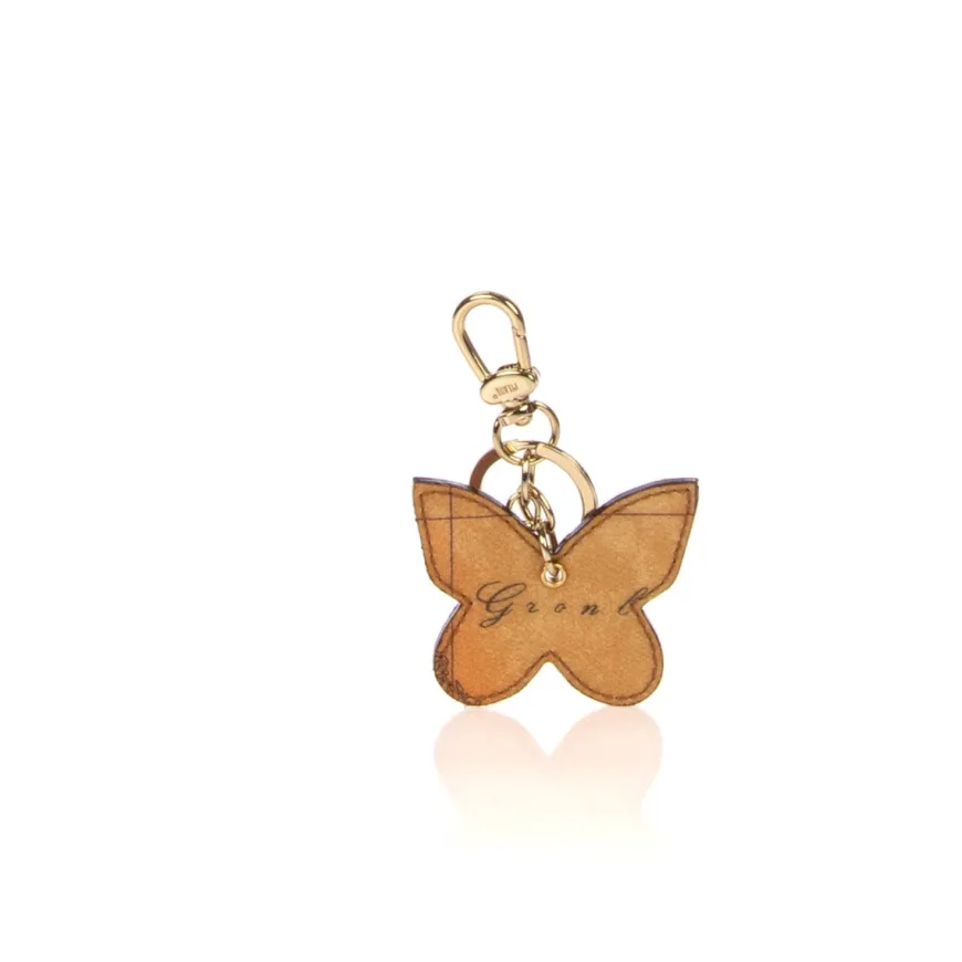 Portachiavi da donna a forma di farfalla in tessuto stampa Geo Classic. Metalleria in oro chiaro protetto. MADE IN ITALY.