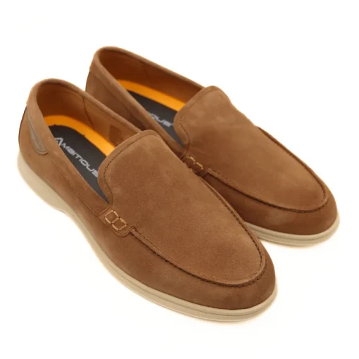 Mocassino college uomo, elegante e informale della collezione AMBITIOUS. Tomaia in pelle scamosciata cuoio. Interno foderato in pelle marrone, sottopiede ammortizzato ed estraibile. Suola in gomma.