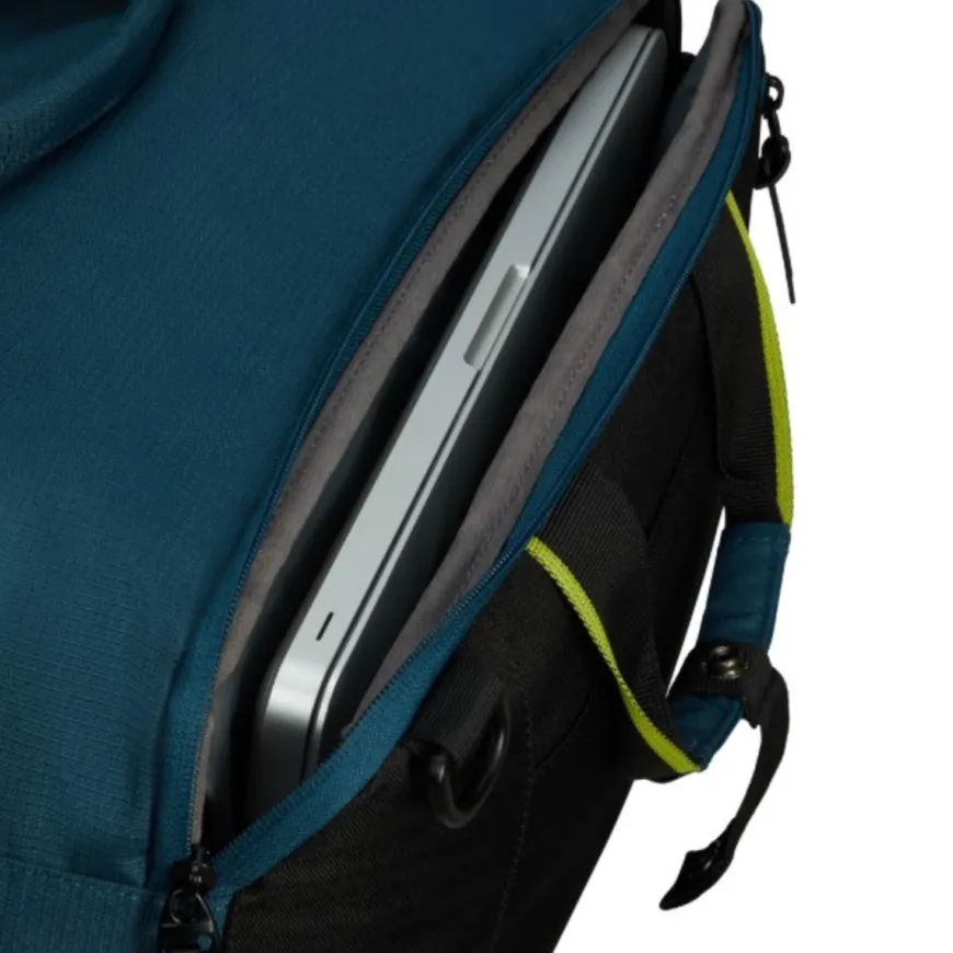 Zaino da viaggio di AMERICAN TOURISTER della linea TAKE2CABIN, realizzato in tessuto ottanio. Internamento composto da uno scomparto con ganci ferma abiti. Apposito scomparto porta PC imbottito e protetto. Possibilità di portarta in tre modi a mano, a tracolla, regolabile, e a zaino. Chiusura con zip. Compatibile con Ryanair.