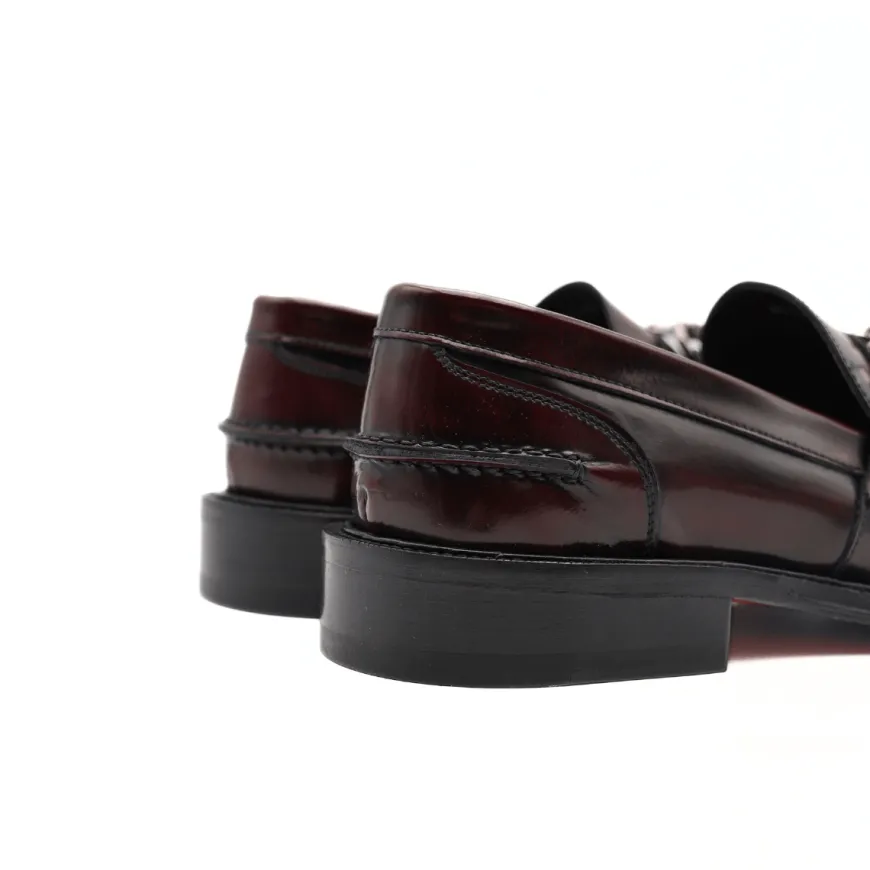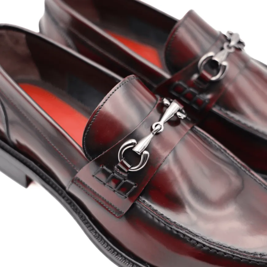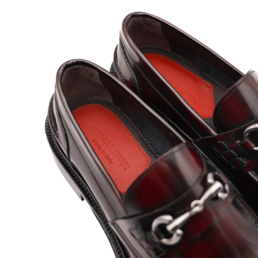 Mocassino da uomo di ANDREA FERRI realizzato in pelle spazzolata bordeaux con accessorio argento. Interno e sottopiede, non estraibile, in pelle. Suola in cuoio (3cm).