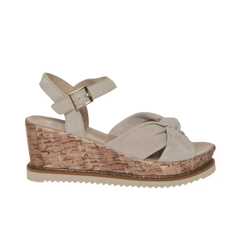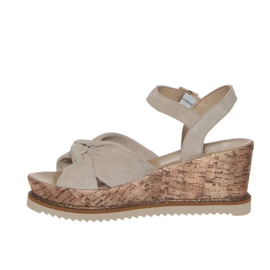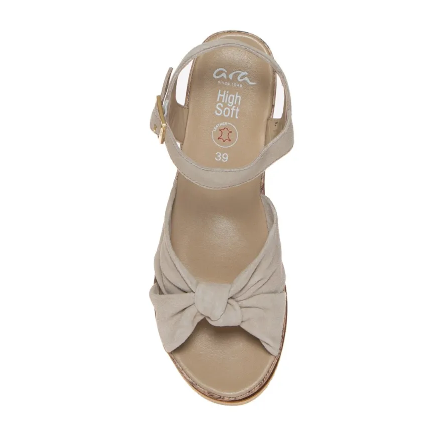 Sandalo con zeppa da donna di ARA . Tomaia realizzata in camoscio color beige, con fiocco. Interno e sottopiede foderati in pelle. Chiusura con cinturino regolabile. Zeppa in sughero e suola in gomma.