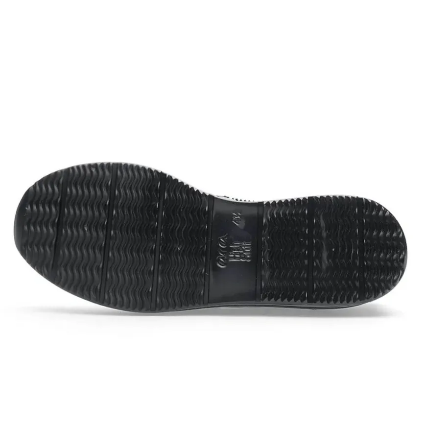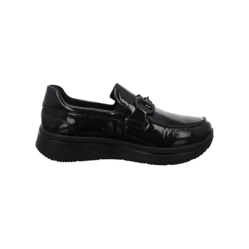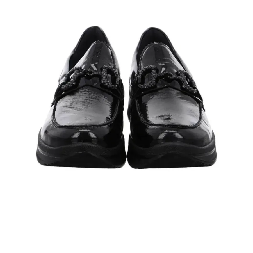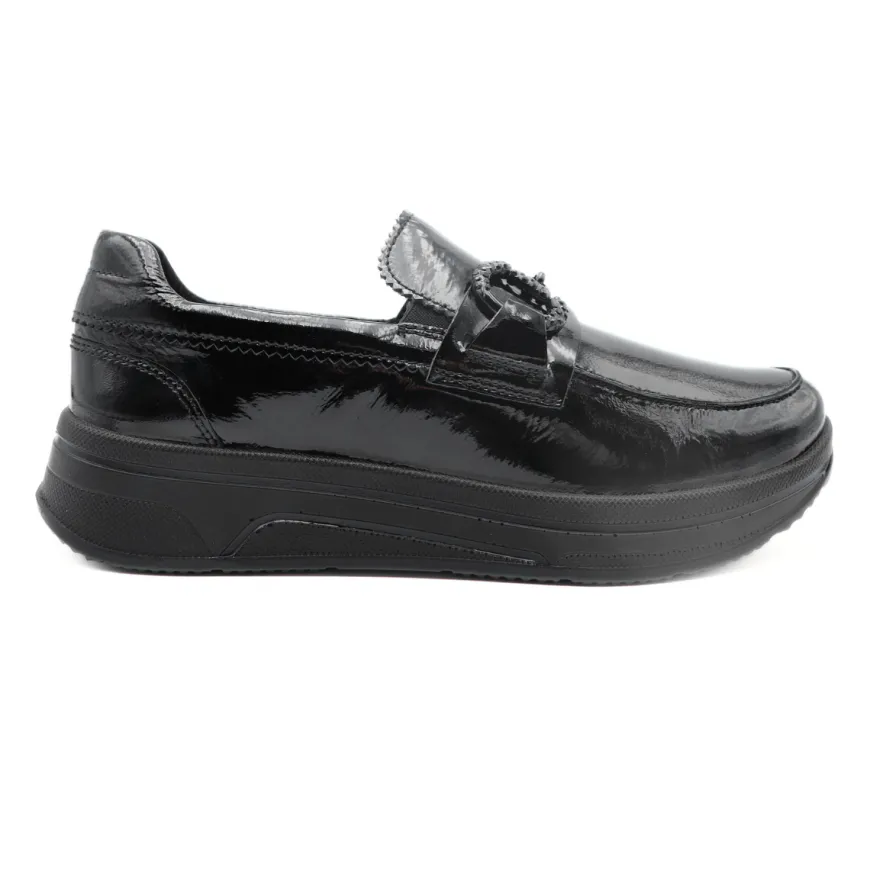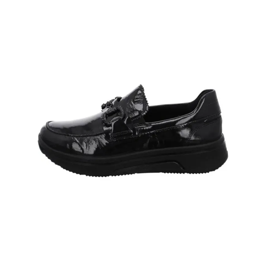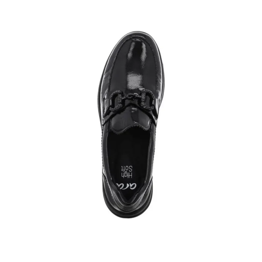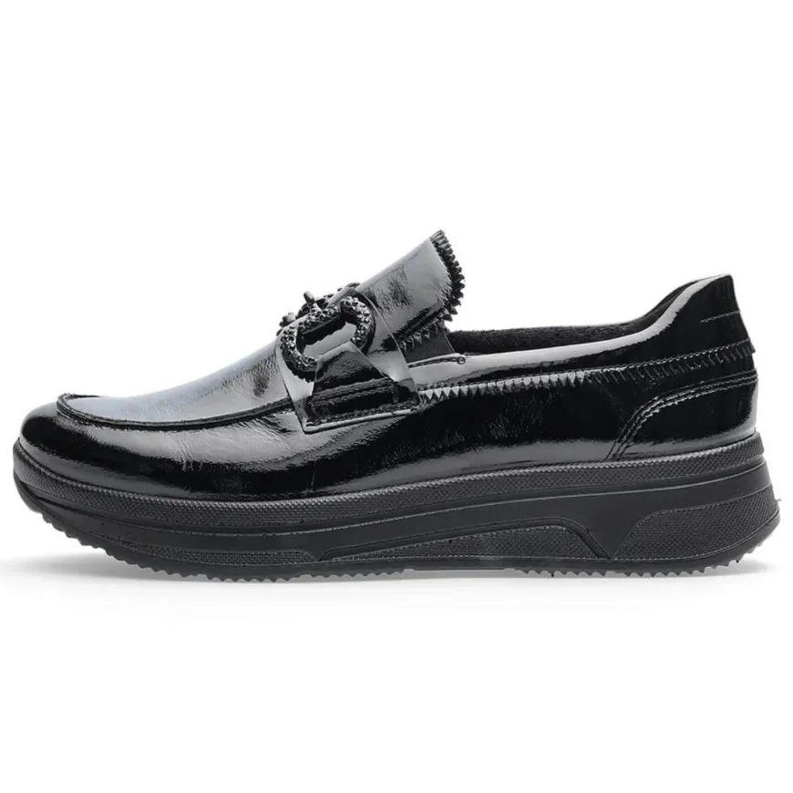 Mocassino in pelle verniciata nero, di ARA, decorata con morsetto con brillantini nero. Comoda calzata, morbido plantarino in pelle High Soft. Suola con profilo alto, altezza 3 cm.