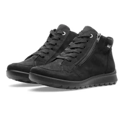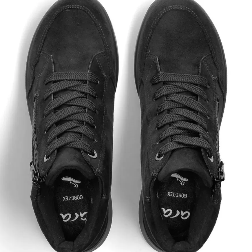 Le sneakers di ARA sono comode e confortevoli. La sneaker alta in camoscio nero, con calzata veloce e facile. Interno in pelle e sottopiede in tessuto con la tecnologia Goretex, ammortizzato ed estraibile. Chiusura con lacci e zip unilaterale. Suola in gomma.