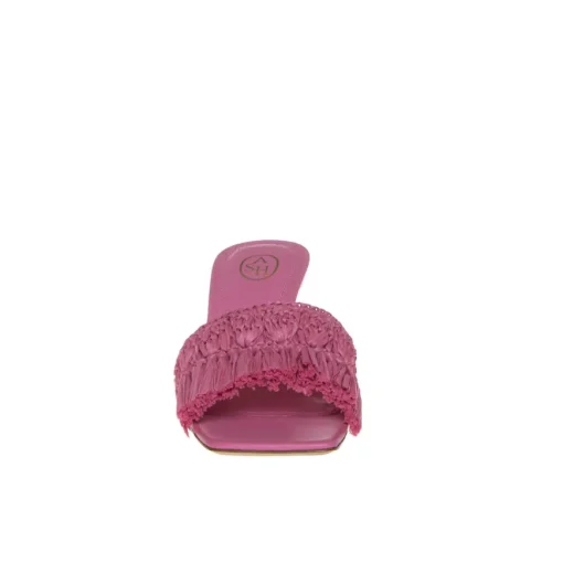 Ciabattina alla moda da donna di ASH. Realizzata in rafia color fucsia. Interno foderato in pelle. Suola in cuoio con punta quadrata. Tacco a rocchetto rivestito.