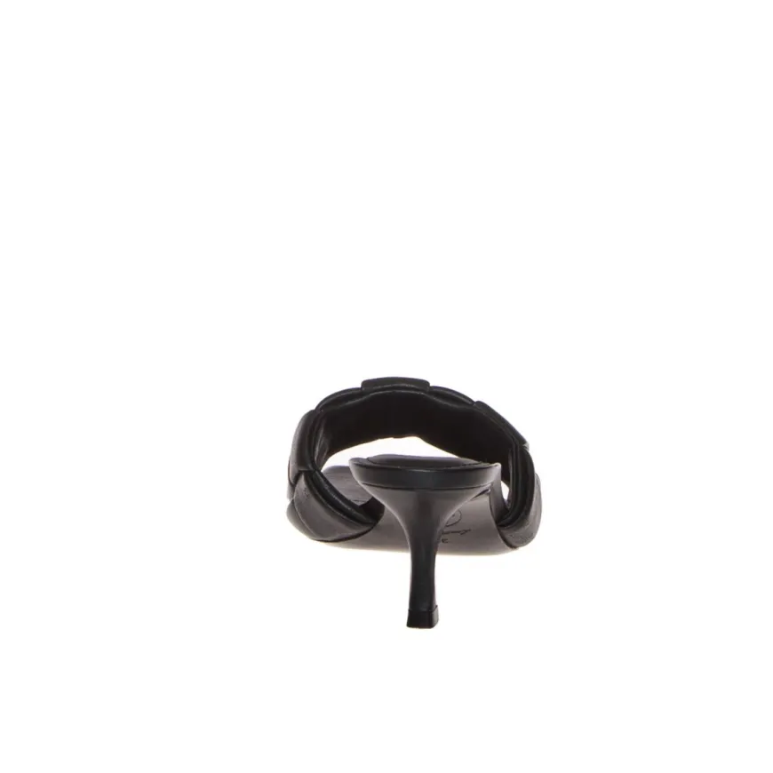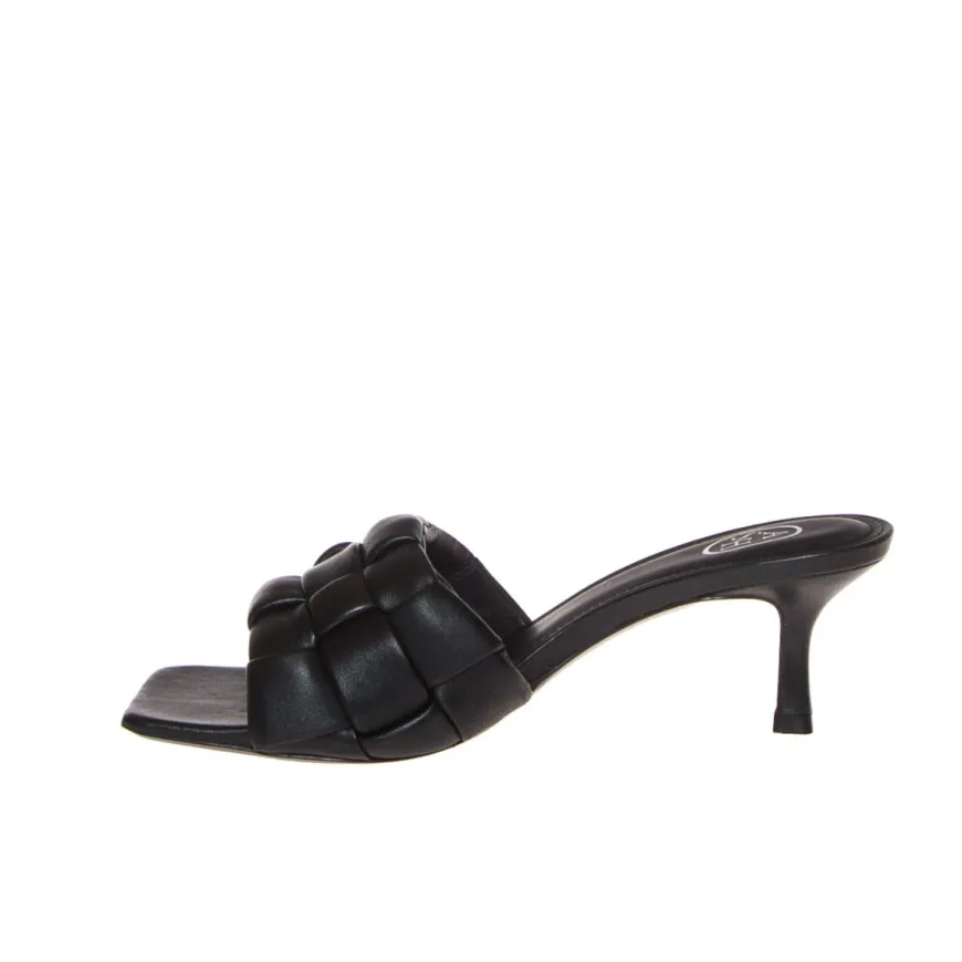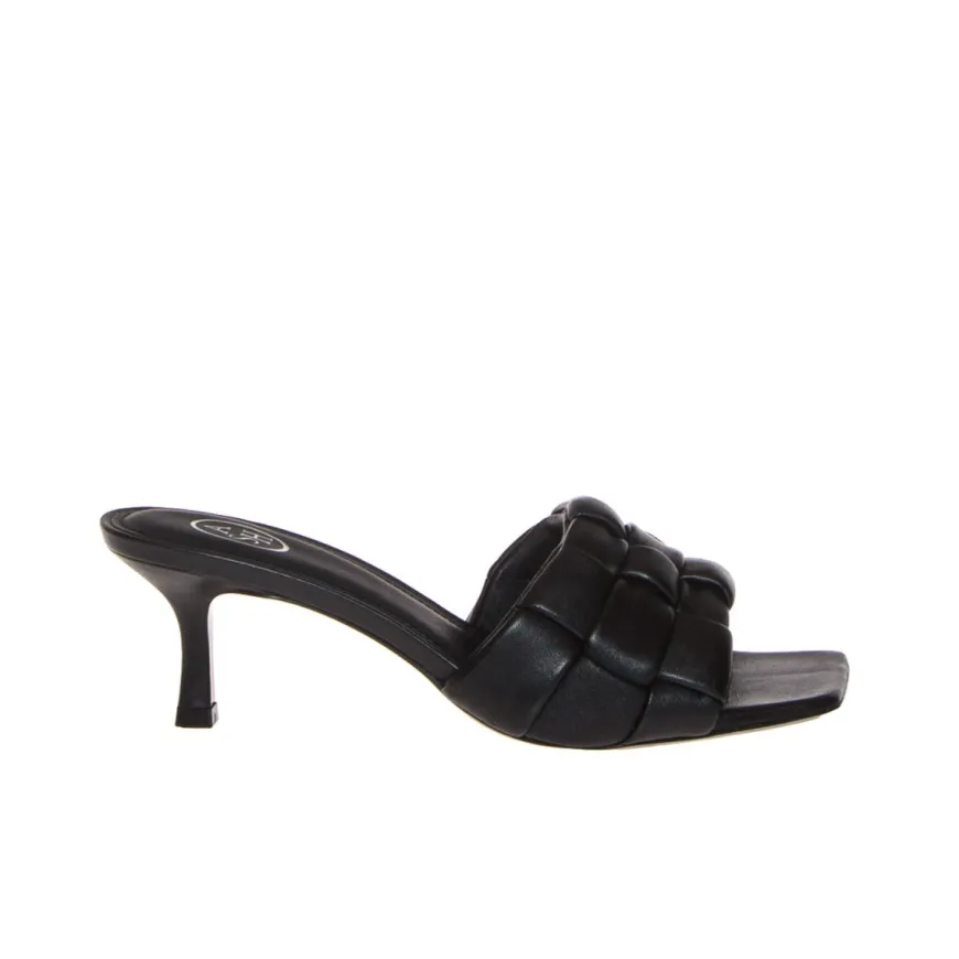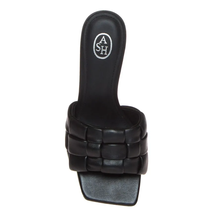 Ciabattina alla moda da donna di ASH. Realizzata in pelle intrecciata nera. Interno foderato in pelle. Suola in cuoio con punta quadrata. Tacco a rocchetto rivestito.