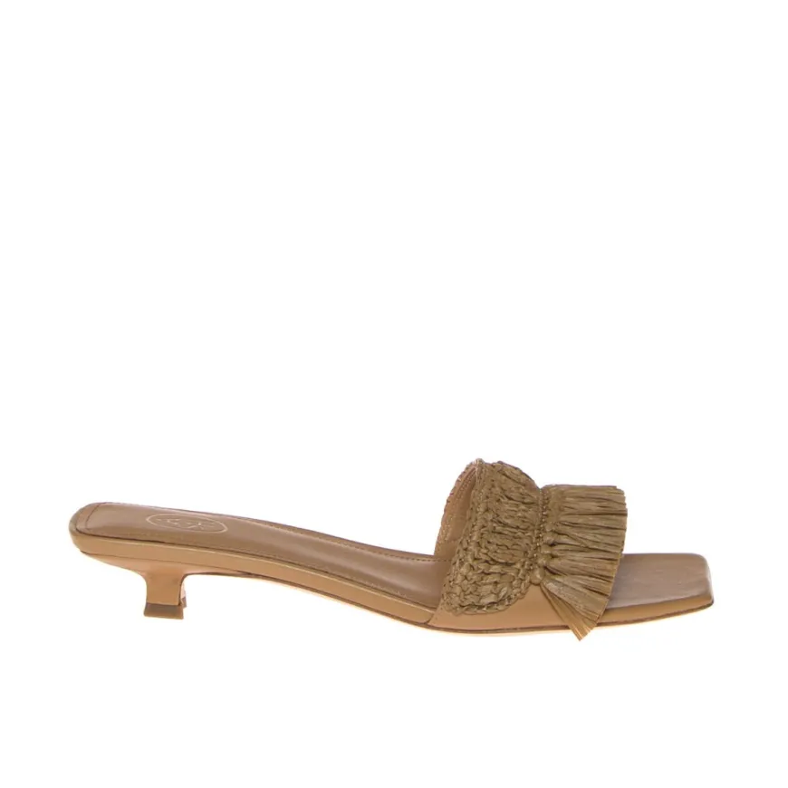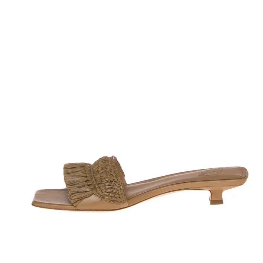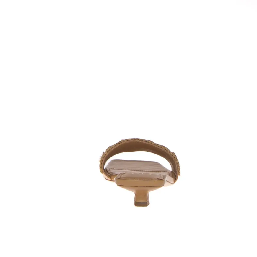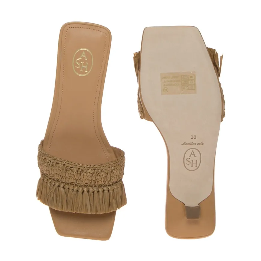 Ciabattina alla moda da donna di ASH. Realizzata in rafia color sabbia. Interno foderato in pelle. Suola in cuoio con punta quadrata. Tacco a rocchetto rivestito.
