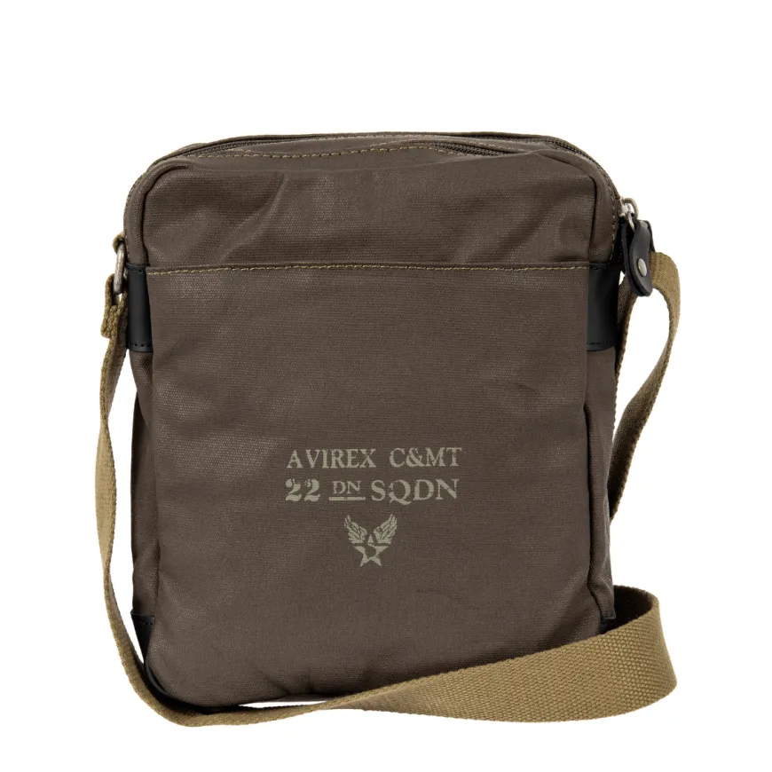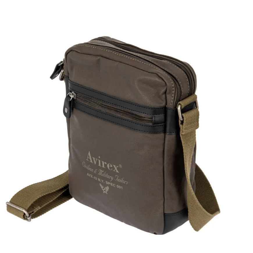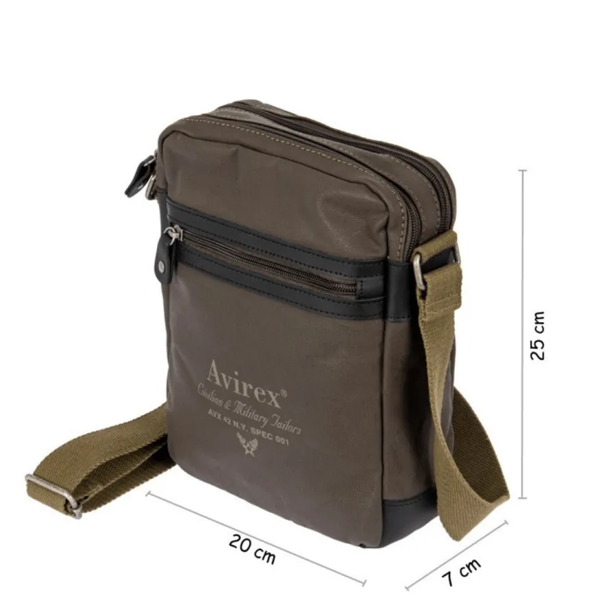 Borsello da uomo di AVIREX realizzato in tessuto color fango. Interno unico comparto con tasche accessorie. Tracolla in tessuto verde militare regolabile. Chiusura con cerniera.