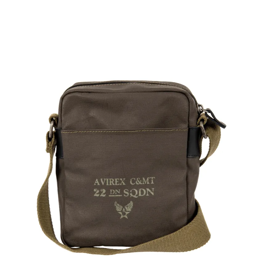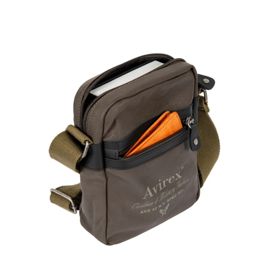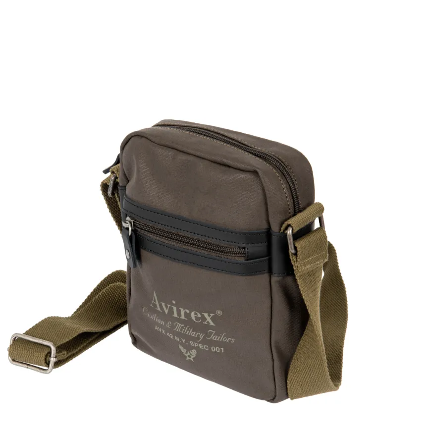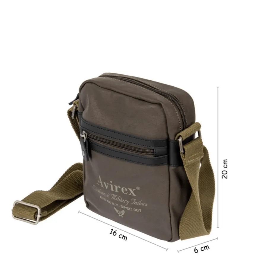 Borsello da uomo di AVIREX realizzato in tessuto color fango. Interno unico comparto con tasche accessorie. Tracolla in tessuto verde militare regolabile. Chiusura con cerniera.