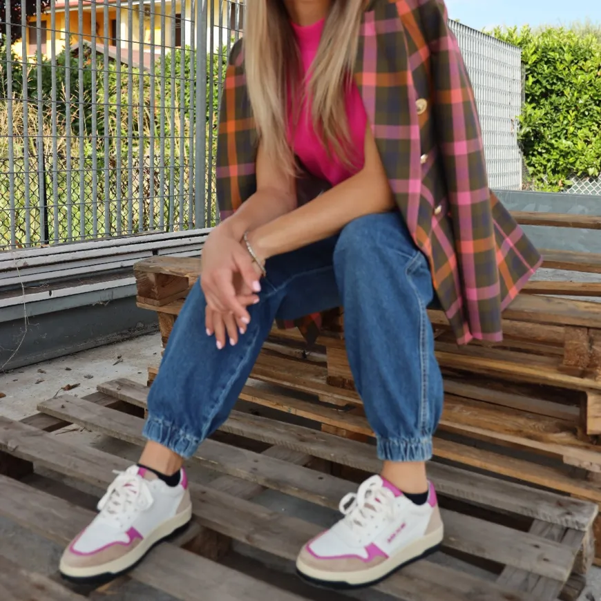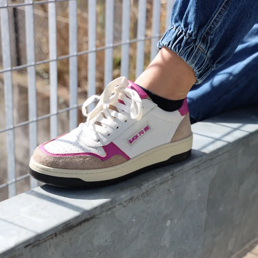 Sneaker da donna di BACK70, realizzata in pelle bianca, con dettaglio fuxia e in camoscio color cipira. Internamente foderata, plantare interno sagomato ed estraibile. Suola in gomma. Chiusura con lacci.