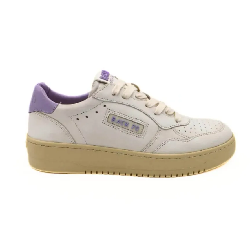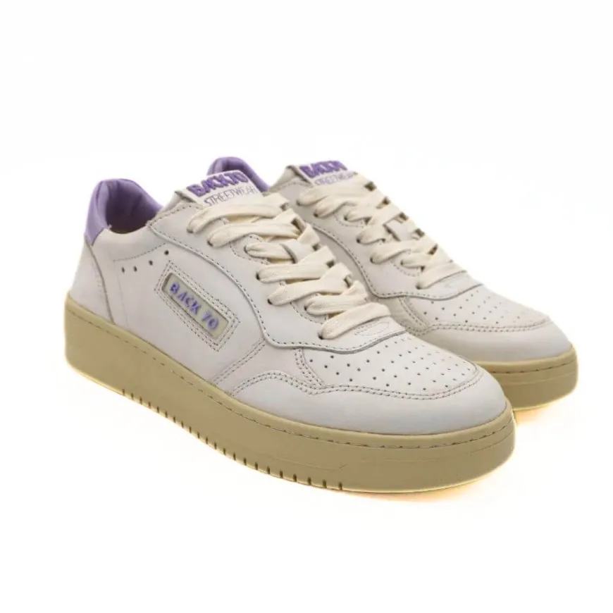 Sneaker da donna, di BACK70. Realizzata in pelle bianca, con tallone lilla. Internamente foderata in pelle e tessuto con sottopiede non estraibile. Chiusura con lacci. Suola in gomma (altezza 3cm).