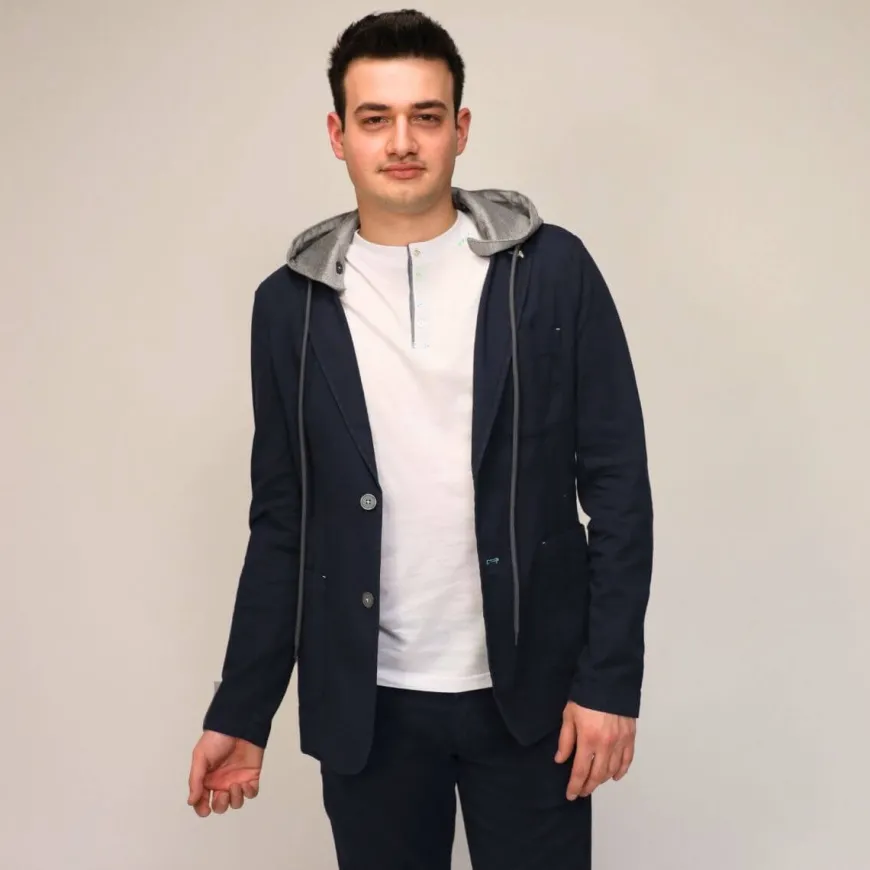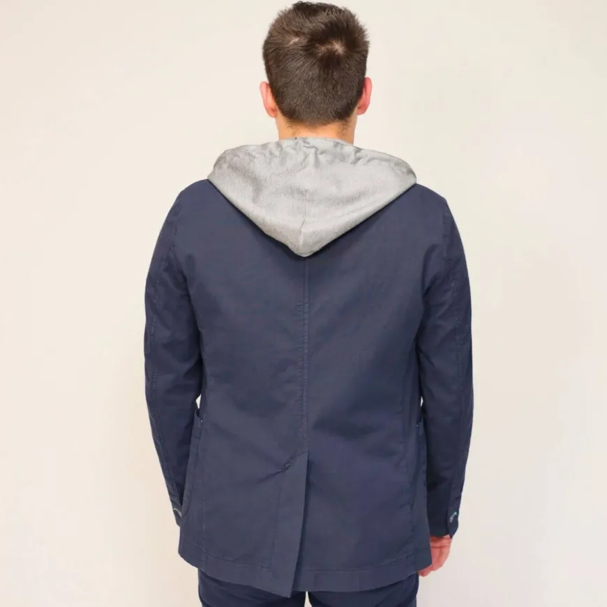 Giacca sportiva da uomo di BERNA realizzata in tessuto blu con capuccio , removibile, in contrasto in colore grigio. Chiusura con bottoni.