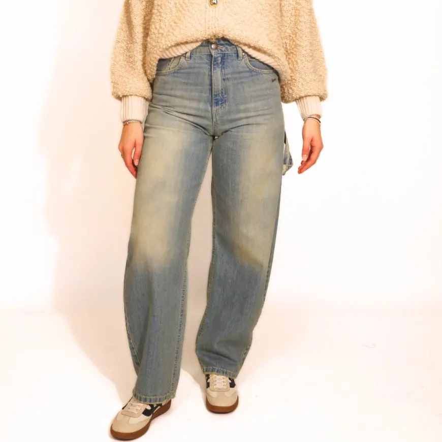 Jeans baggy da donna, di BERNA. Realizzati in cotone color jeans slavato, con fibbie alla vita per stringerlo.