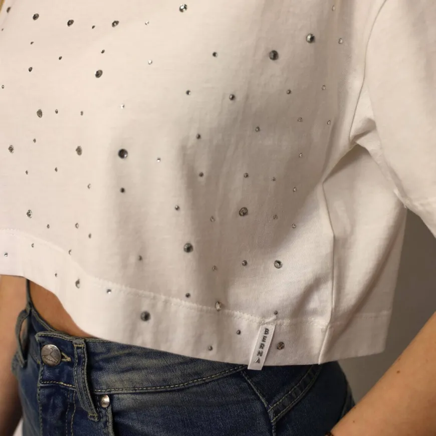 T-shirt da donna crop di BERNA realizzata in tessuto bianco con strass. La modella indossa una M.