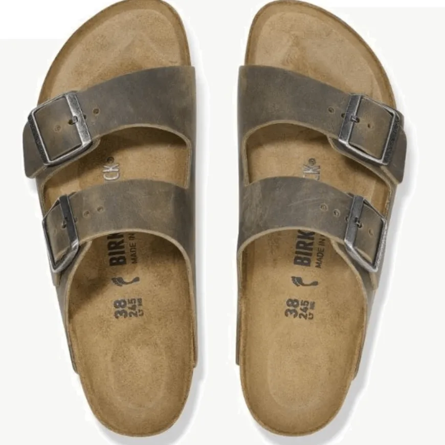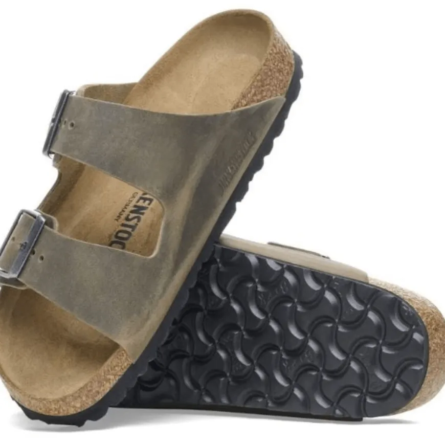 Ciabatta Arizona di Birkenstock con doppia fibbia regolabile in pelle ingrassata colore verde. Plantare dalla forma anatomica in sughero. Suola in EVA. Calzata stretta.