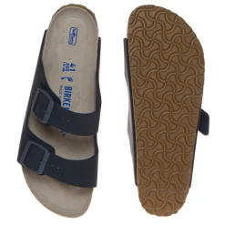 Ciabatta da uomo di BIRKENSTOCK SOFT blu navy. Tomaia Birko-Flor®, esternamente in ecopelle, internamente morbido tessuto traspirante. Plantare in sughero macinato e lattice rivestito in pelle scamosciata, con morbido cuscinetto di rifinitura sulla base. Suola in EVA marrone.