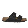 Ciabatta da donna di BIRKENSTOCK. Tomaia realizzata in pelle nera, plantare Soft Footbed anatomico in sughero naturale e sottopiede in pelle scamosciata. Suola marrone in EVA. Fibbie metalliche color nero regolabili. Calzata: NARROW FIT.