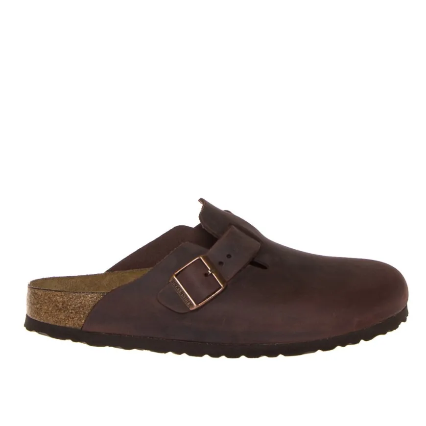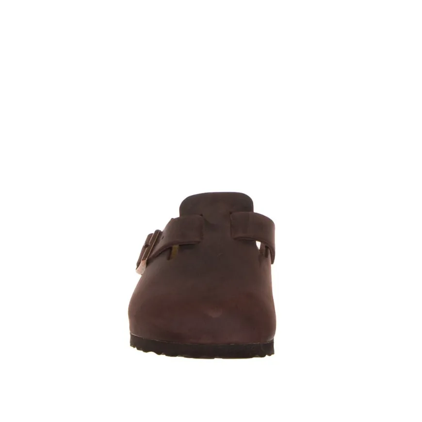 Ciabatta da uomo con punta chiusa di BIRKENSTOCK, modello BOSTON. Tomaia realizzata in pelle oleata marrone con fibbia regolabile. Plantare anatomico in sughero e lattice rivestito in pelle scamosciata. Suola in EVA. Pianta stretta-narrow fit.