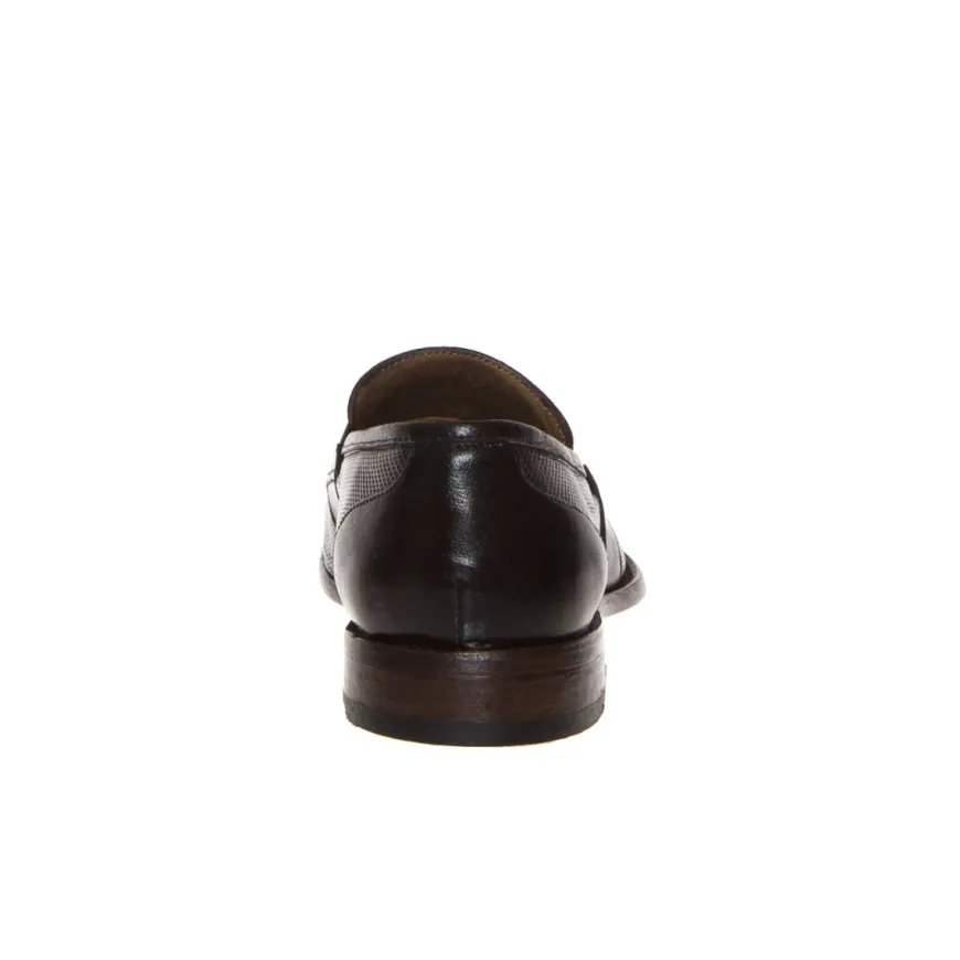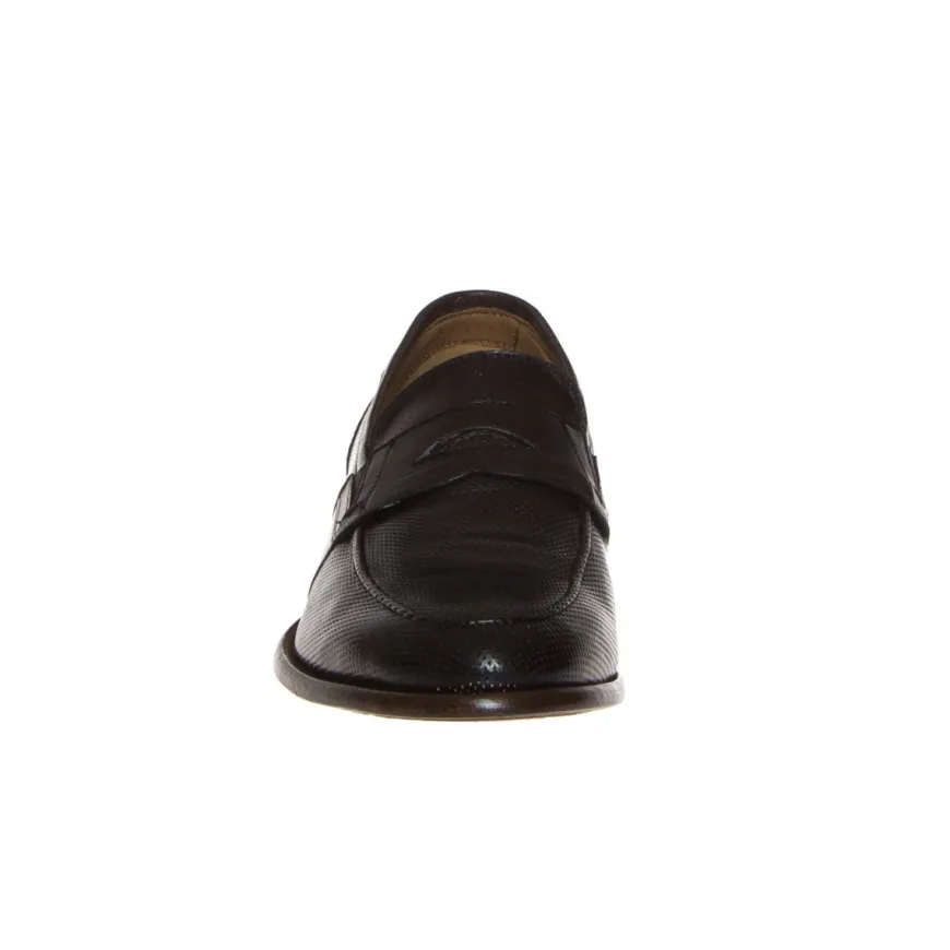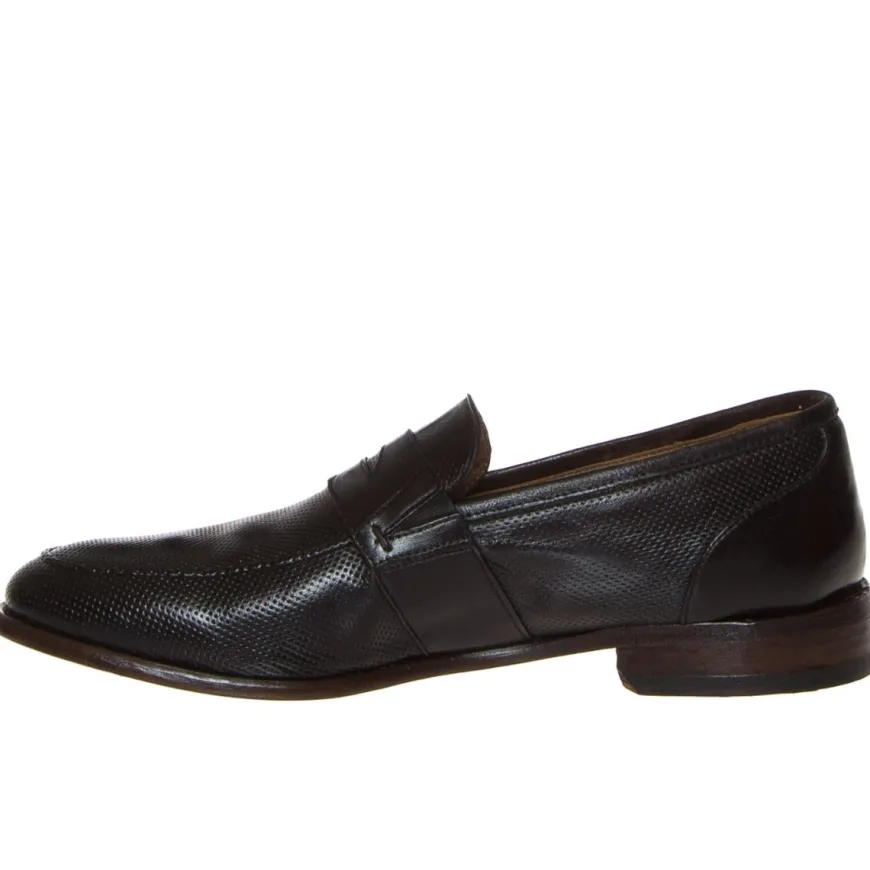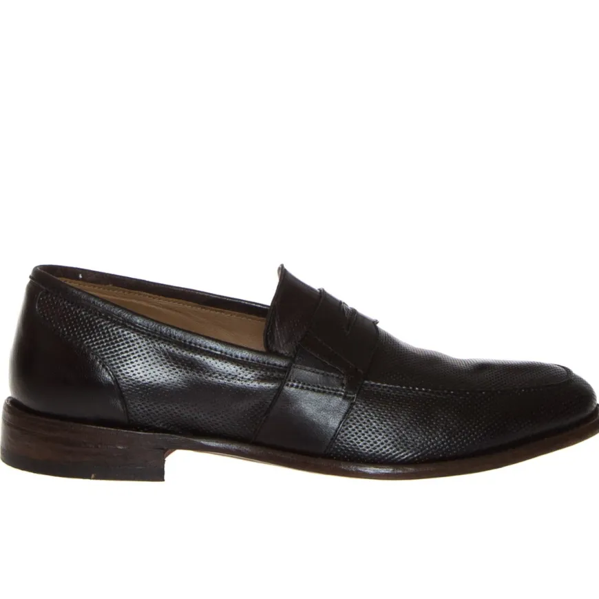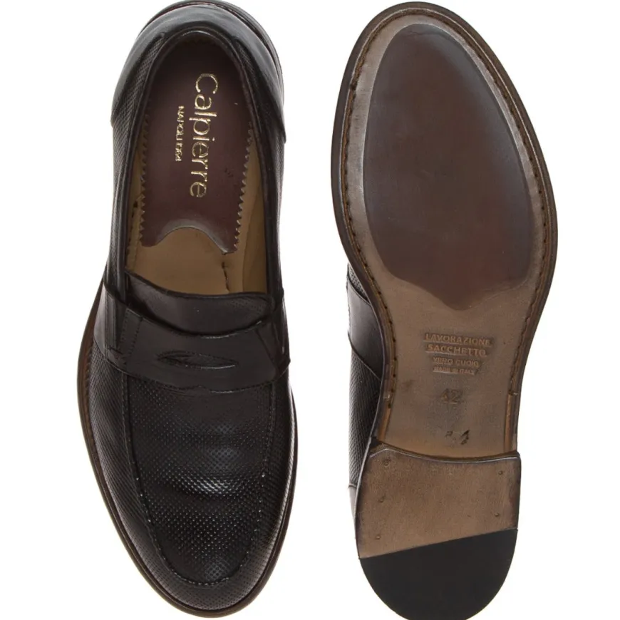 Mocassino da uomo di CALPIERRE. Tomaia realizzata in pelle ponzonata color testa di moro con cuciture a vista e fascetta decorativa frontale. Interno foderato in pelle con sottopiede non estraibile. Suola in gomma.
