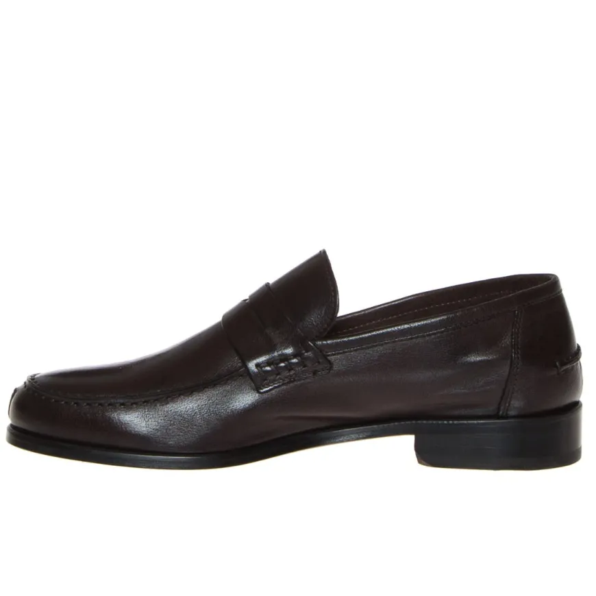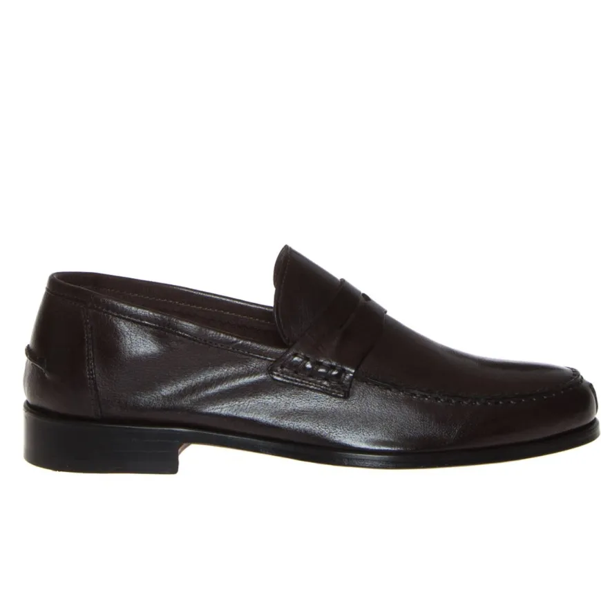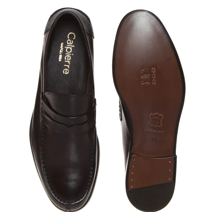 Mocassino da uomo di CALPIERRE. Tomaia realizzata in pelle color testa di moro con cuciture a vista e fascetta decorativa frontale. Interno sfoderato con sottopiede non estraibile. Suola in cuoio. Lavorazione artigianale.