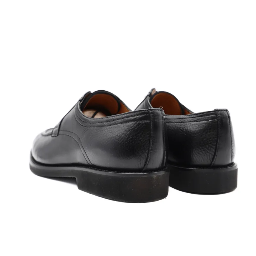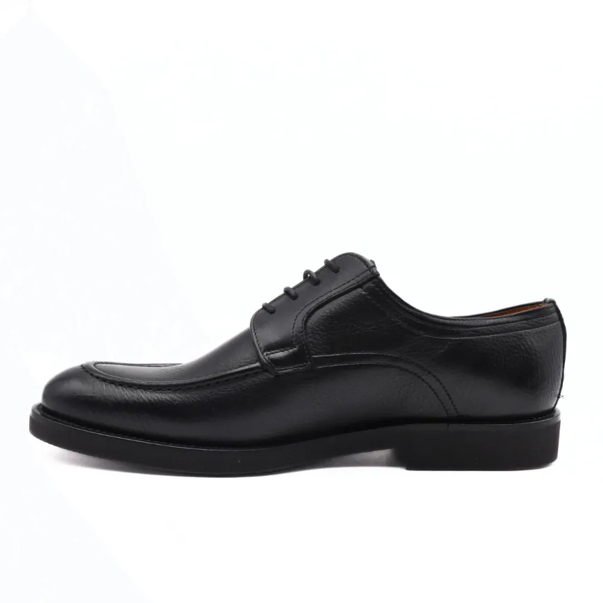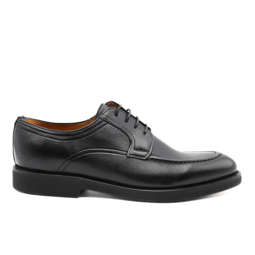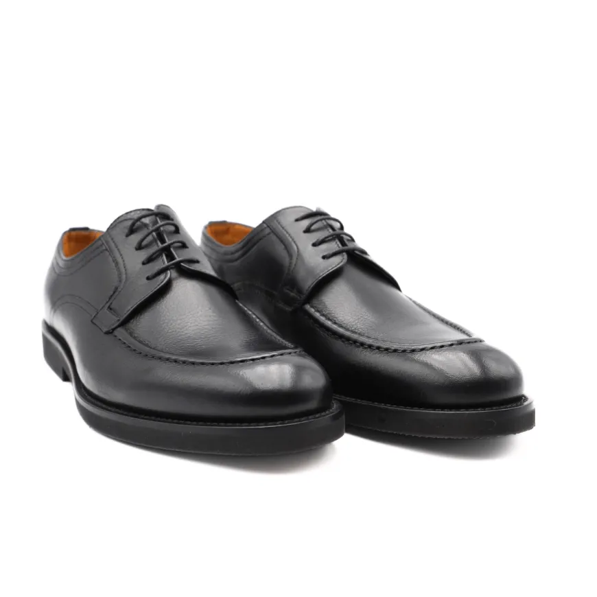 Scarpa, elegante, stringata da uomo di CALPIERRE. Tomaia realizzata in pelle bottalata nera con cuciture a vista. Interno foderato e sottopiede in pelle removibile. Suola in gomma vibram. Chiusura con laccio fino.