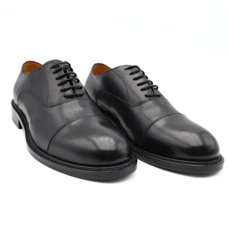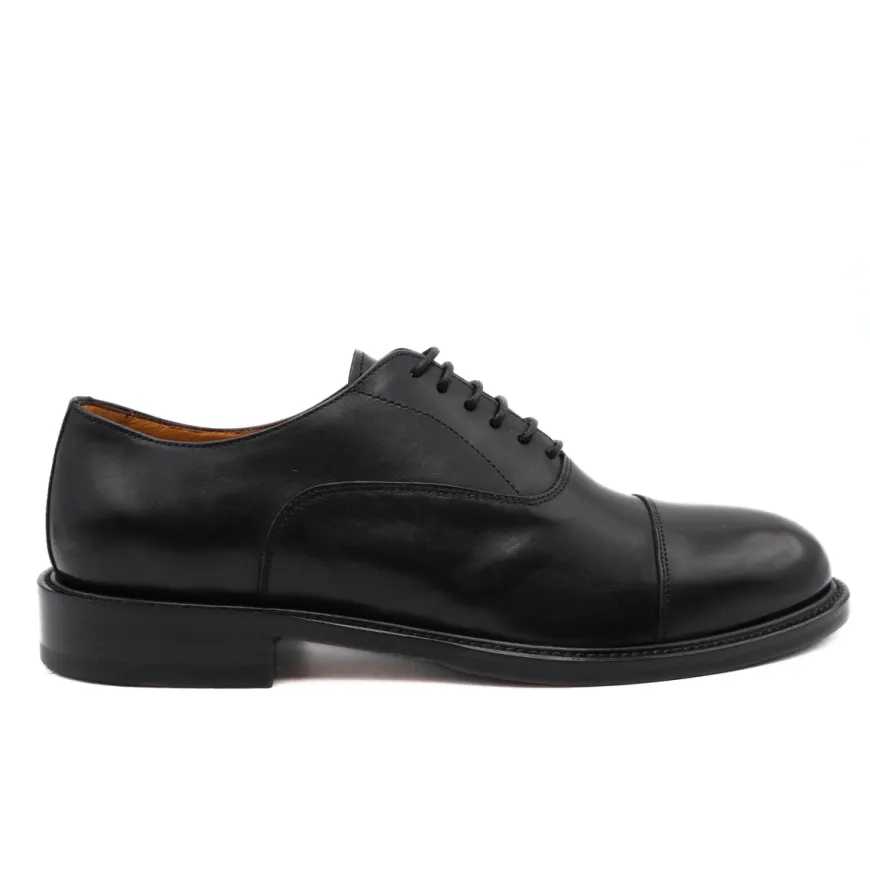 Scarpa, elegante, stringata da uomo di CALPIERRE. Tomaia realizzata in pelle nera con cuciture a vista. Interno foderato e sottopiede in pelle removibile. Suola in gomma e cuoio. Chiusura con laccio fino.