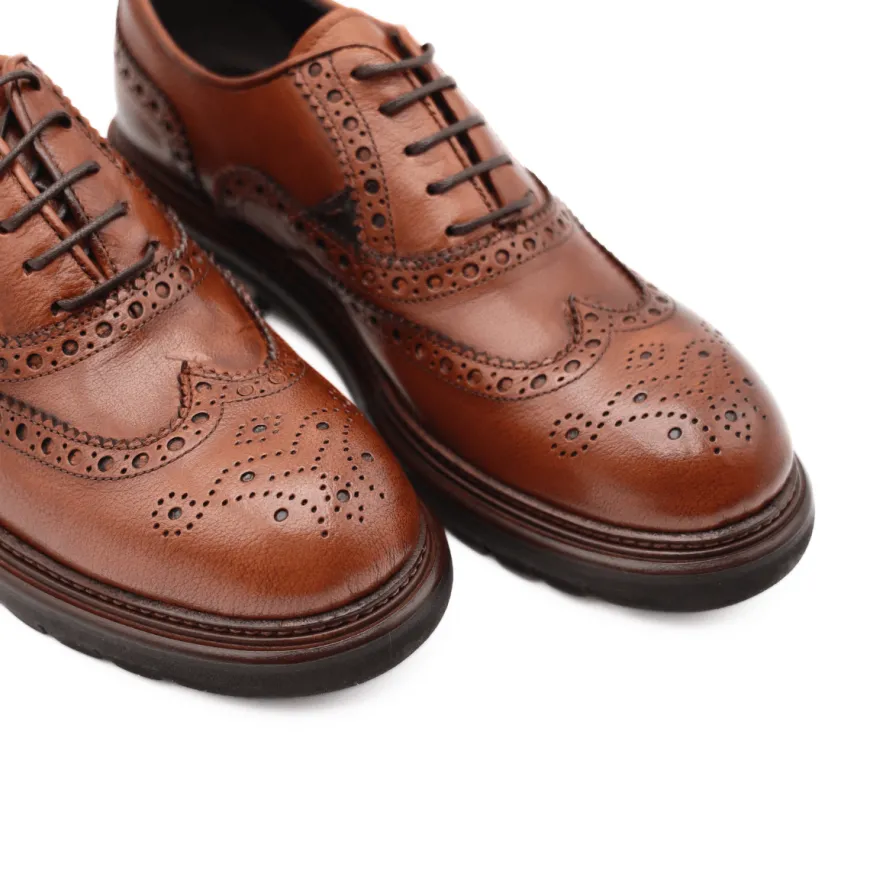 Scarpa, elegante, stringata da uomo di CALPIERRE. Tomaia realizzata in pelle color cuoio con puntale a coda di rondine. Interno foderato e sottopiede in pelle removibile. Suola in gomma. Chiusura con laccio fino.