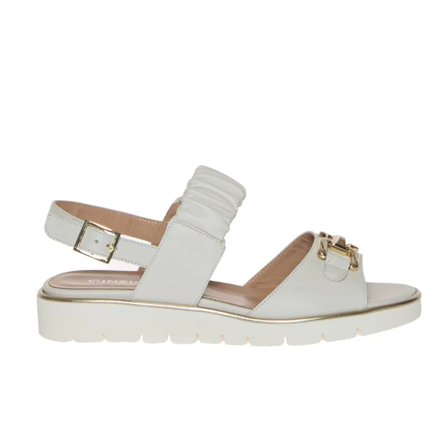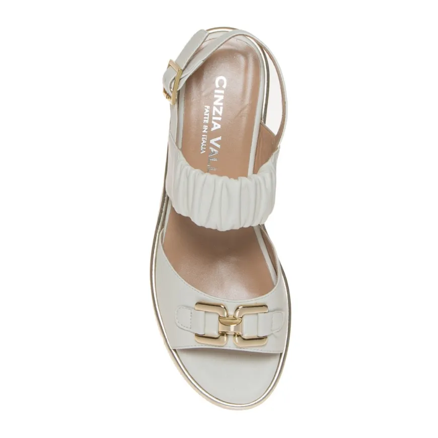 Sandalo elegante in pelle nappata bianca, con accessorio morsetto dorato di CINZIA VALLE. Fascia elasticizzata effetto rigonfiato nel dorso, posteriormente chiusa con fibbietta dorata. Internamente morbido soffietto nel sottopiede rifinito in pelle. Suola in leggerissima gomma poliuretanica extraligt, tacco largo 4 cm, platform 2 cm. Calzatura con vestibilità comoda; ideata, disegnata e realizzata in Italia, prodotto made in Italy.