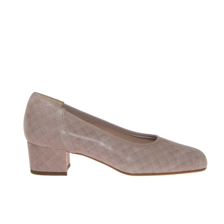 Décolleté donna di CINZIA VALLE. Tomaia realizzata in pelle nabuk beige stampata con collarino in tessuto. Interno foderato in pelle con sottopiede anatomico e traspirante. Suola in cuoio con tacco rivestito in nabuk. Made in Italy