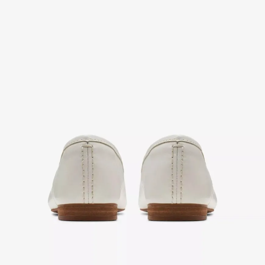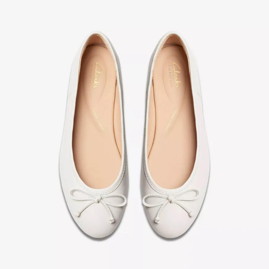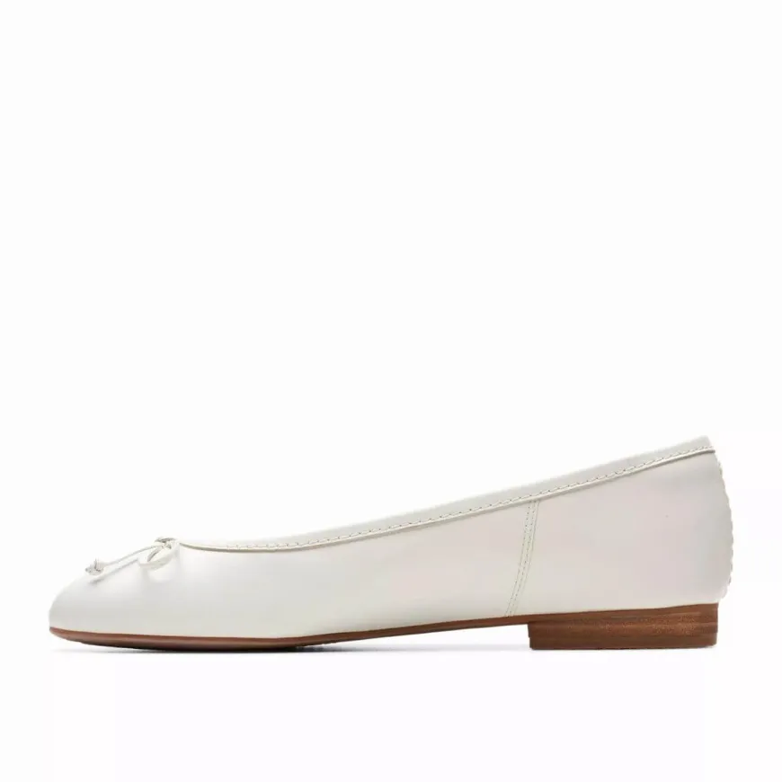 Ballerina da donna di Clarks. Realizzata in pelle color bianco decorata con fiocco. Interno foderato in pelle e con sottopiede non estraibile. Suola in gomma con tacchetto 1.5cm.