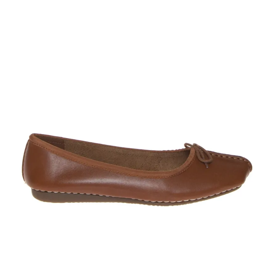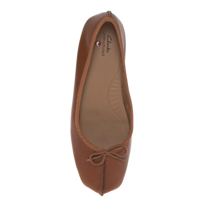 Ballerina donna di Clarks. Realizzata in morbida pelle colore cuoio decorato con fiocco e cuciture a vista. Interno foderato in soffice pelle e con sottopiede unstructured. Suola in gomma.