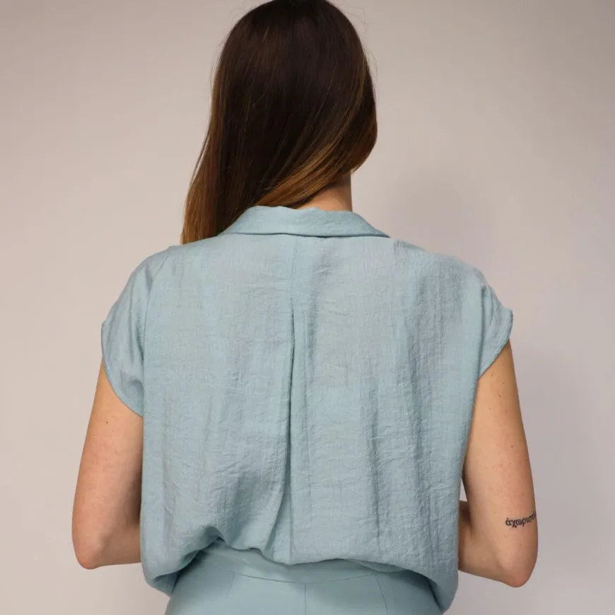 Camicia da donna di CROCHÈ con smanicata color acqua con colletto e chiusura con bottone. La modella è alta 1.68cm e veste una M
