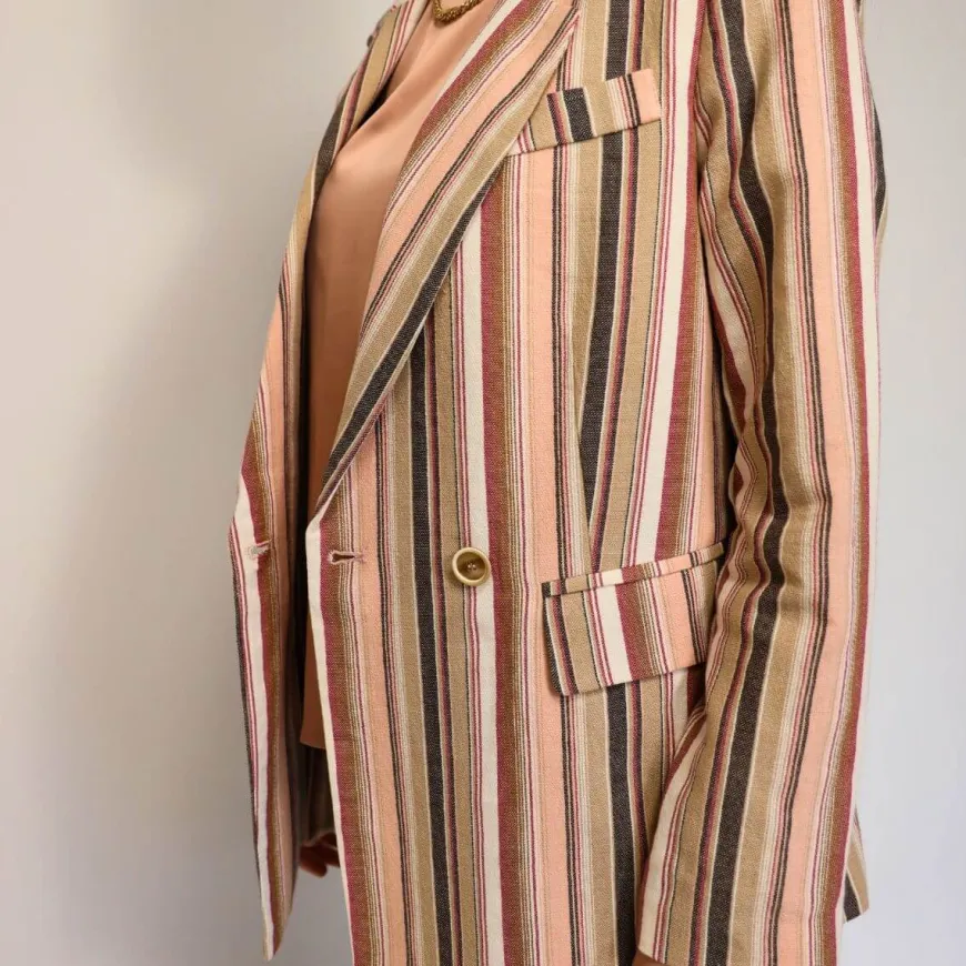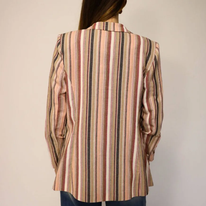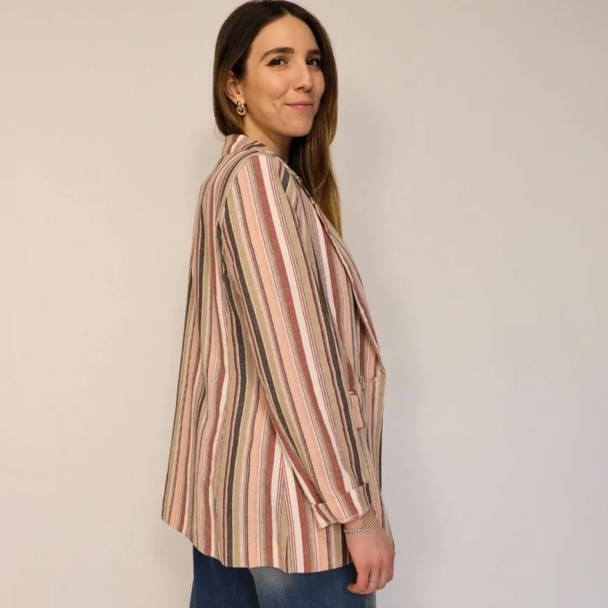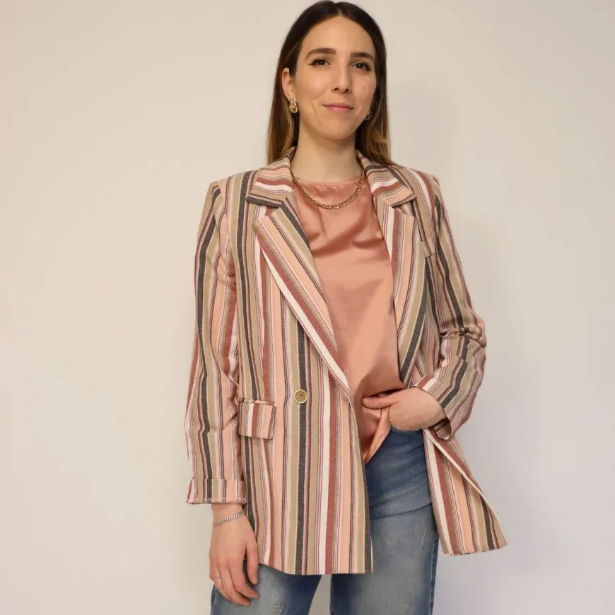 Giacca doppio petto sfoderata da donna di CROCHÈ realizzata in tessuto a righe. Chiusura con bottone. La modella è alta 1.68 cm e veste una M.