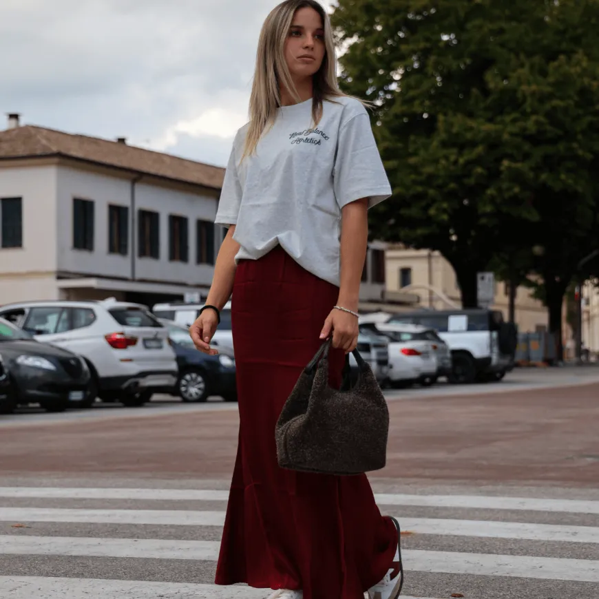 Gonna lunga da donna di CROCHÈ, realizzata in tessuto effetto raso bordeaux con elastico in vita. Vestibilità regolare, la modella indossa una S.