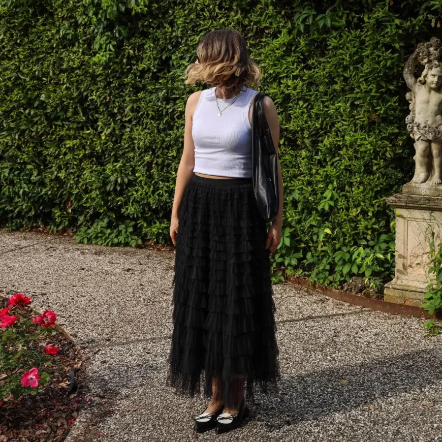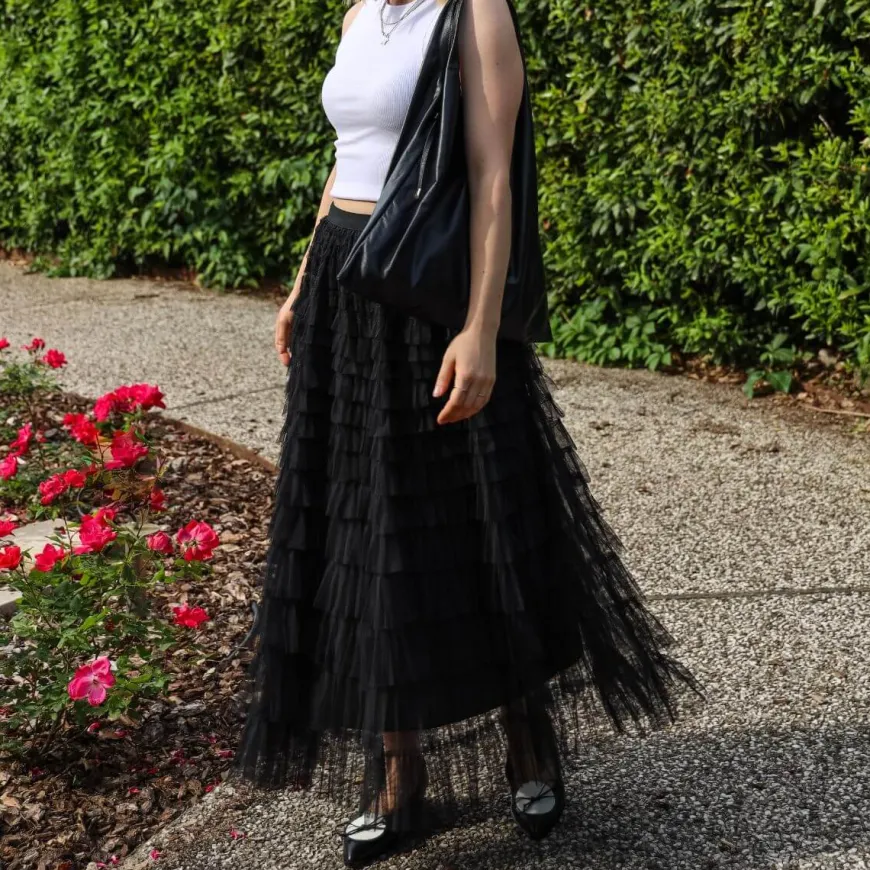 Gonna lunga plissettata di CROCHÈ realizzata in tessuto tulle nero, con elastico in vita e fodera interna. Vestibilità regolare.
