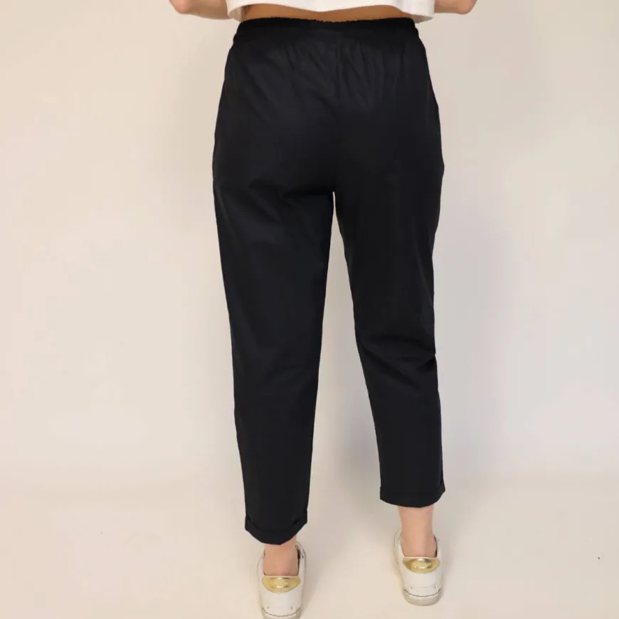 Pantalone leggero da donna di CROCHÈ, realizzato in tessuto nero con chiusura con elastico e couliss. La modella è alta 1.68 cm e veste un M.