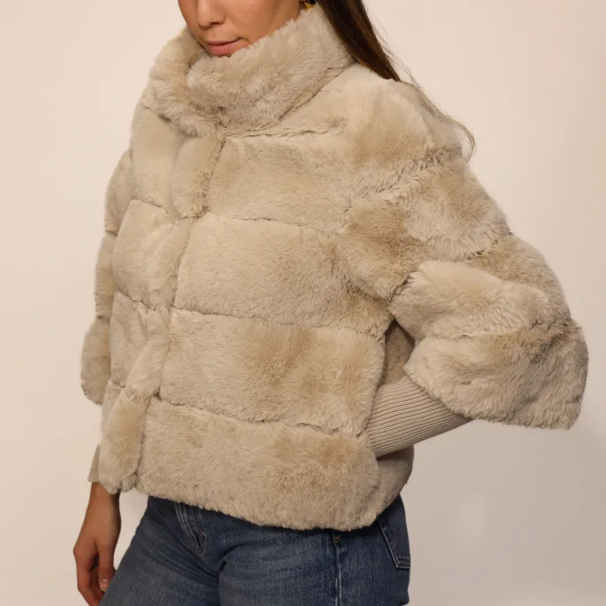 Pelliccia, da donna di Crochè. Realizzata in poliestere color beige con manicotto. Chiusura con bottoni clip.