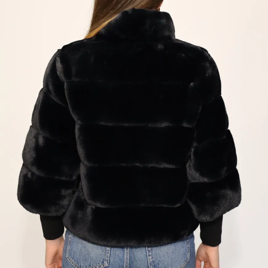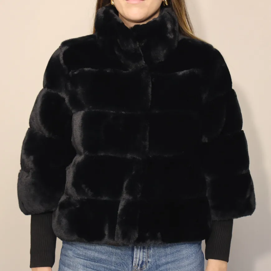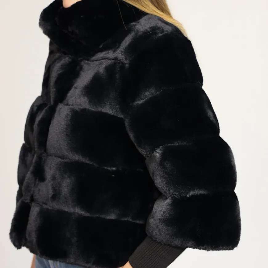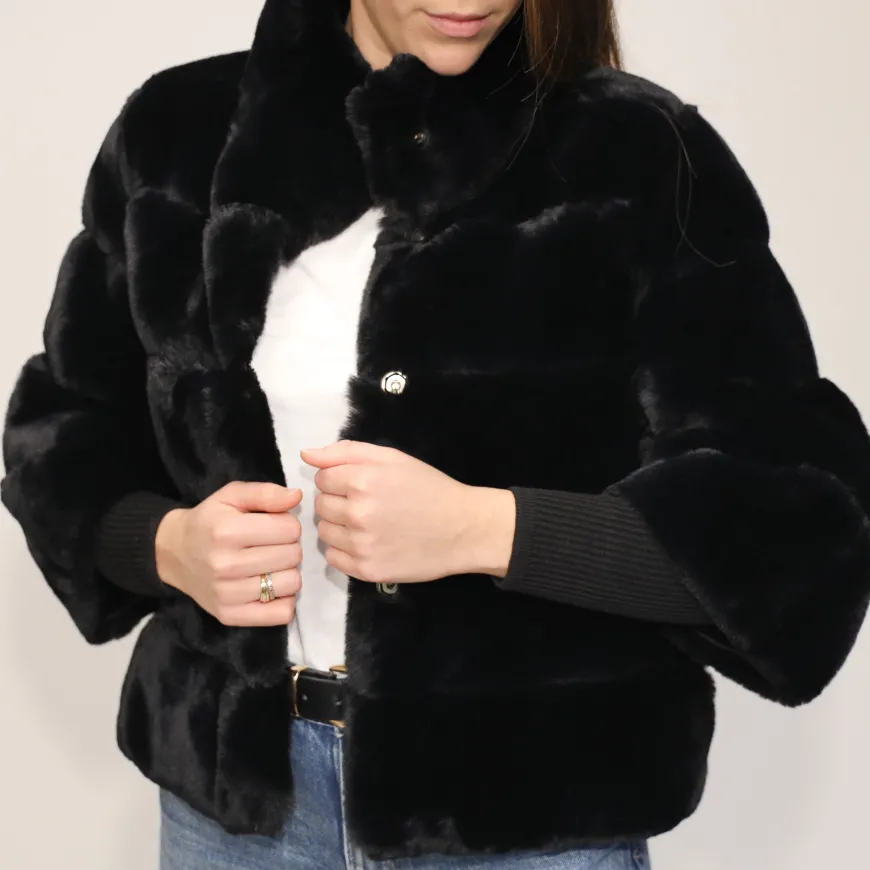 Pelliccia, da donna di Crochè. Realizzata in poliestere nero con manicotto. Chiusura con bottoni clip.