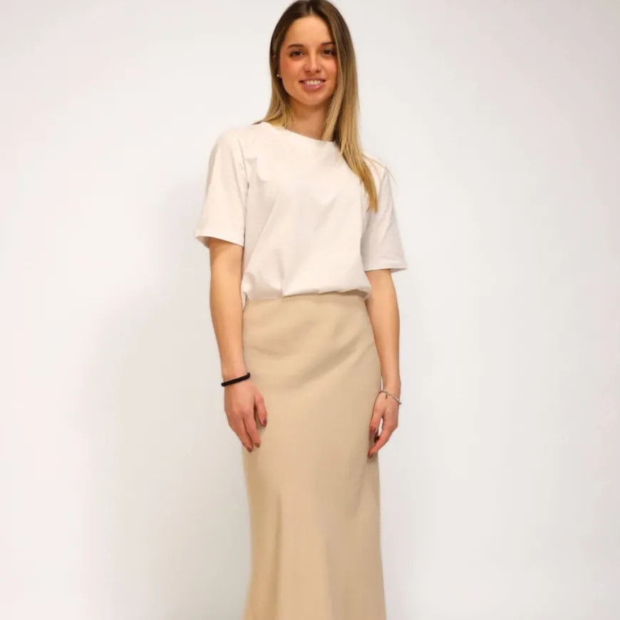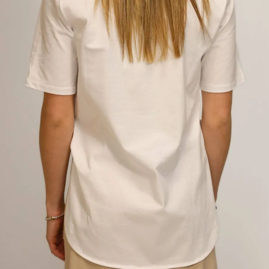 Semplice T-shirt da donna bianca di CROCHÈ con giro collo e retro più lungo.