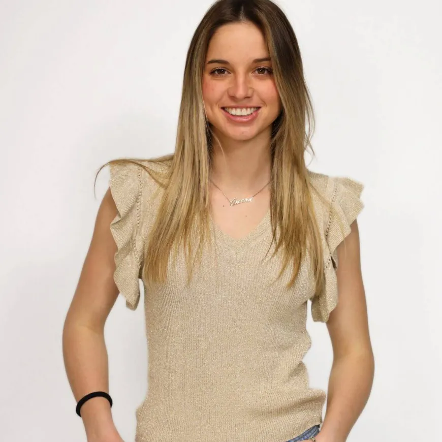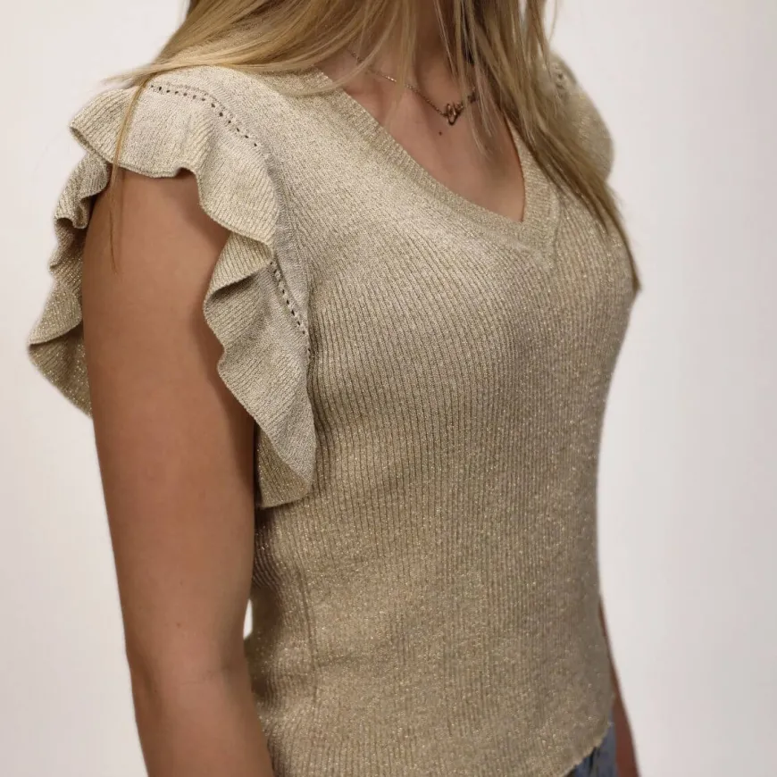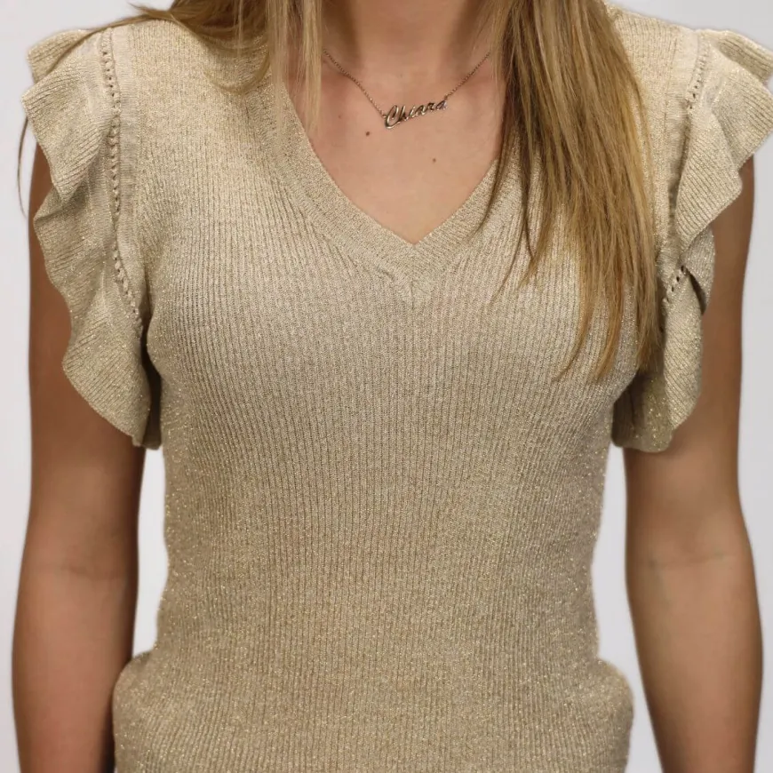 Maglietta in lurex oro di CROCHÈ con manica a rouches e scollo a V.