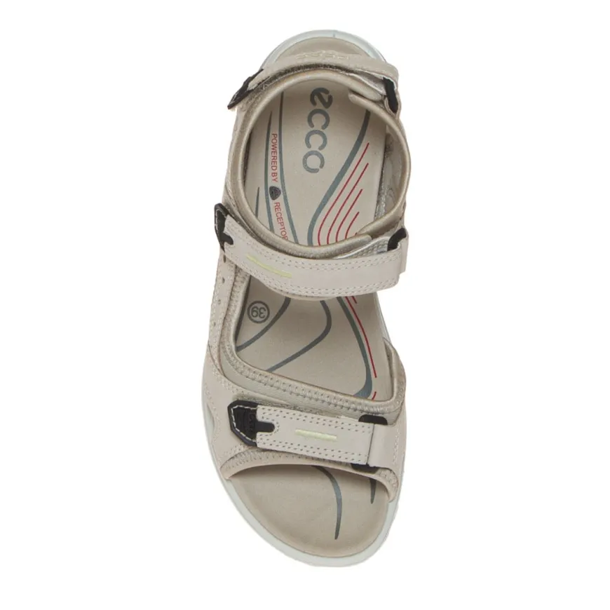 Sandalo donna di ECCO, realizzato in nabuk ingrassato beige, rifinito con tessuto tecnico elasticizzato nella fodera, per massima aderenza. Larghezza regolabile con tre strappi, sottopiede sagomato con zone a densità diversa. Suola in gomma con tecnologia RECEPTOR™ che garantisce un ottimo supporto al piede nelle fasi di appoggio e stacco.