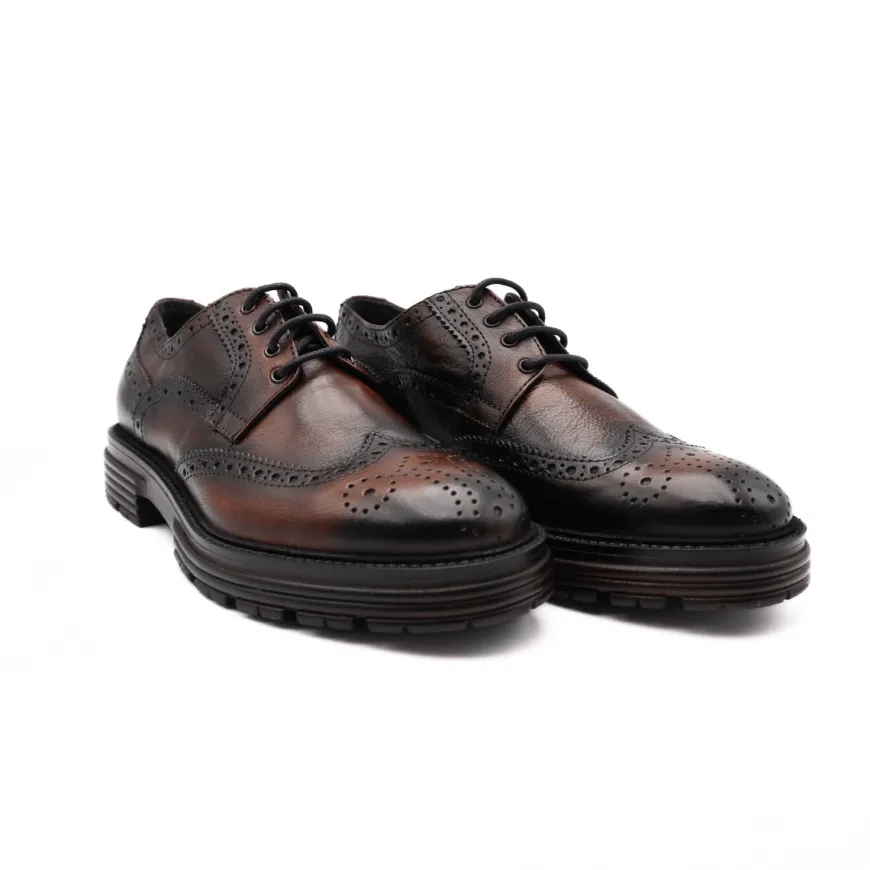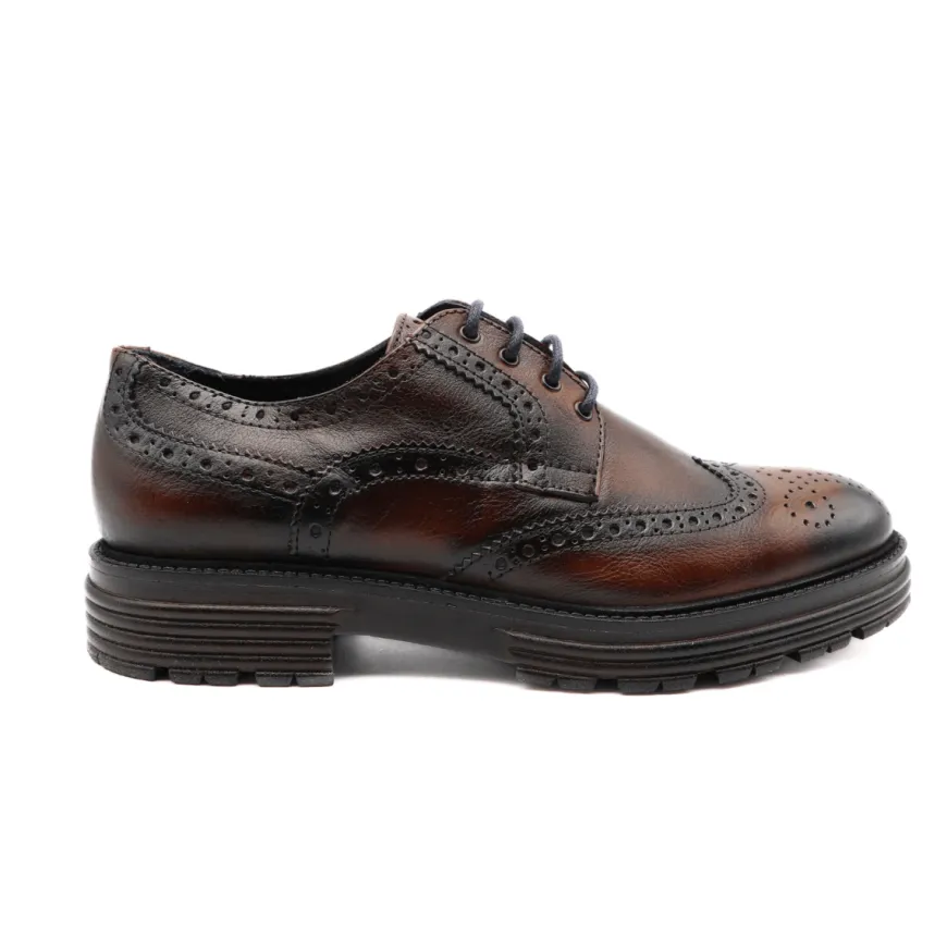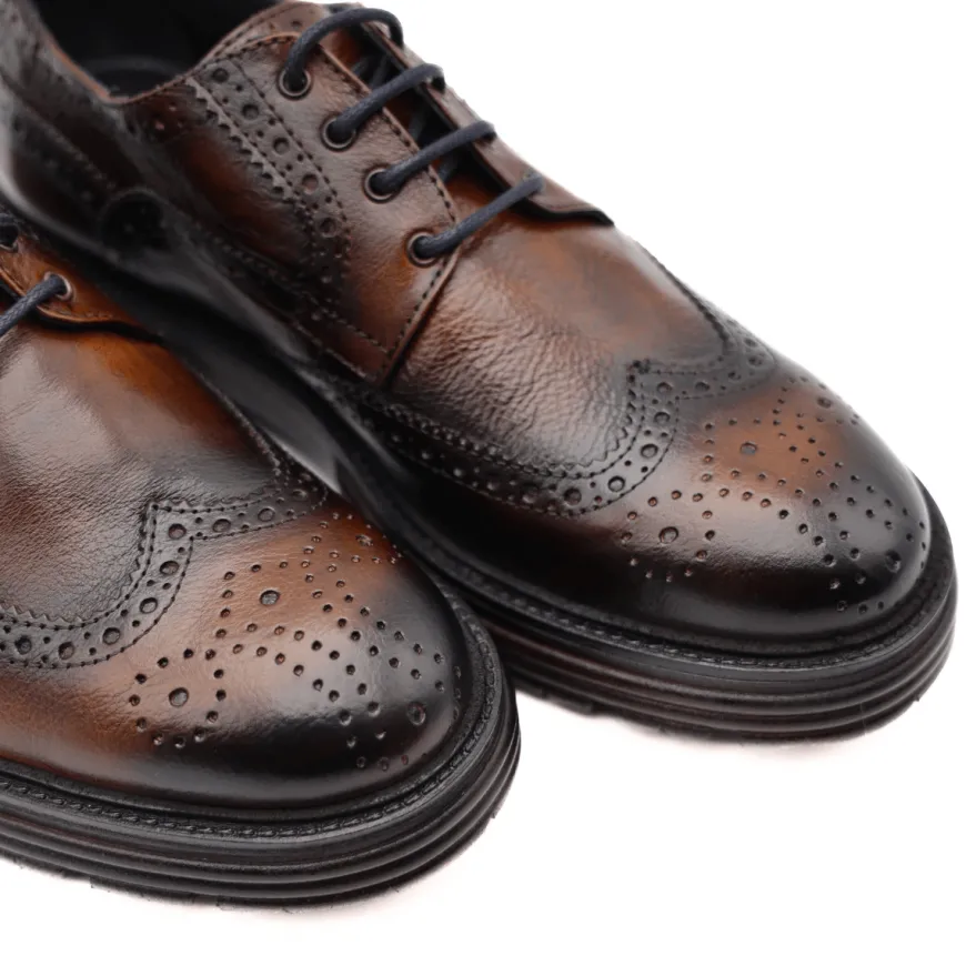 Stringata da uomo modello derby di F.LLI RENELLA, realizzata in pelle sfumata cuoio con lavorazione all’inglese. Interno e sottopiede, non estraibile, foderati in pelle. Chiusura con laccio. Suola in gomma carroarmato antiscivolo.