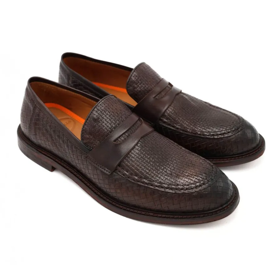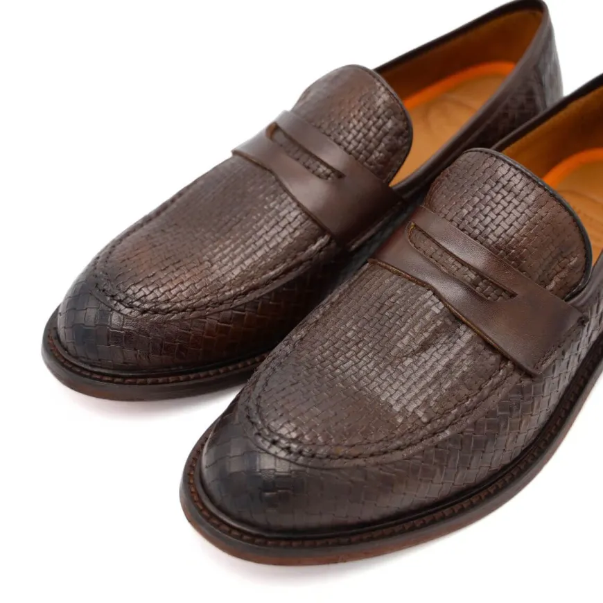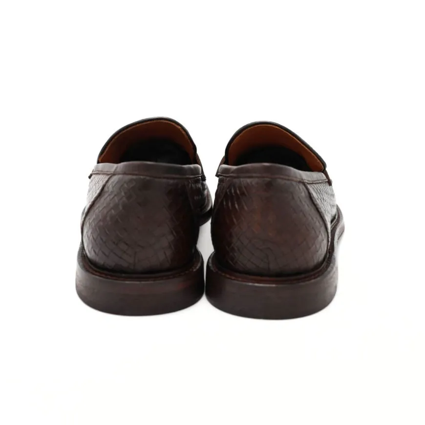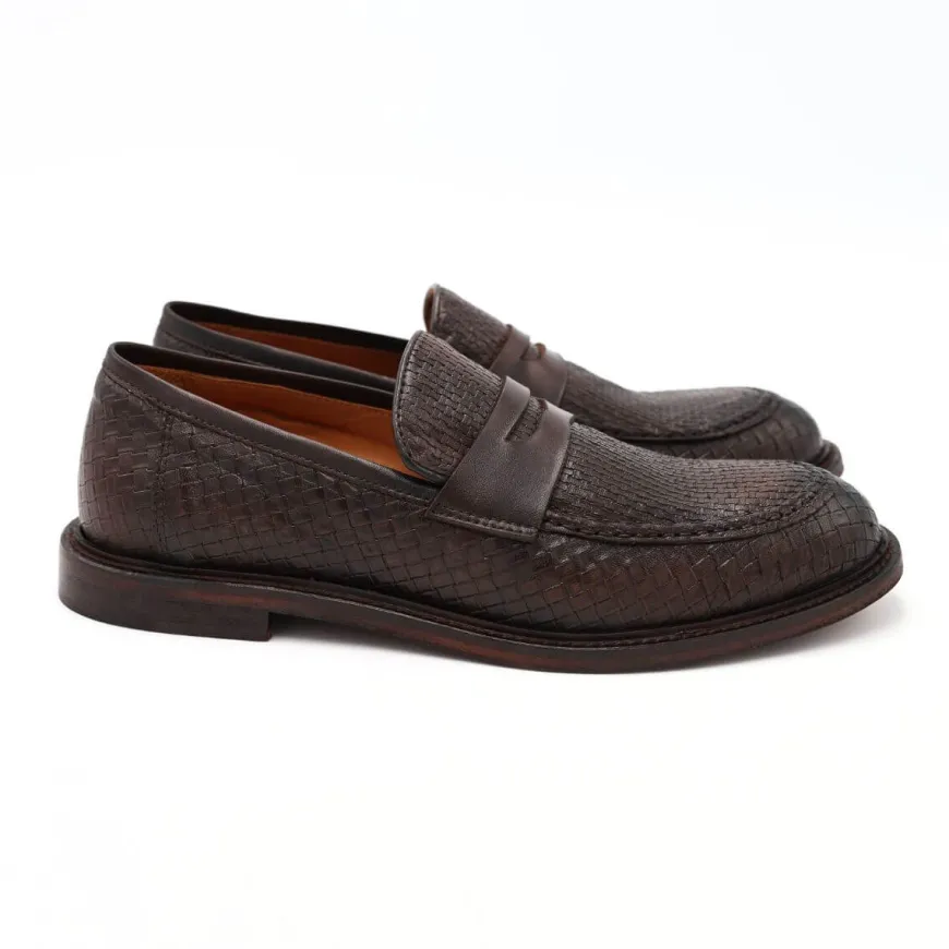 Mocassino da uomo di FRATELLI RENNELLA. Tomaia realizzata in pelle intrecciata color testa di moro, con mascherina e cuciture a vista. Interno foderato e sottopiede in pelle. Suola in cuoio e gomma.