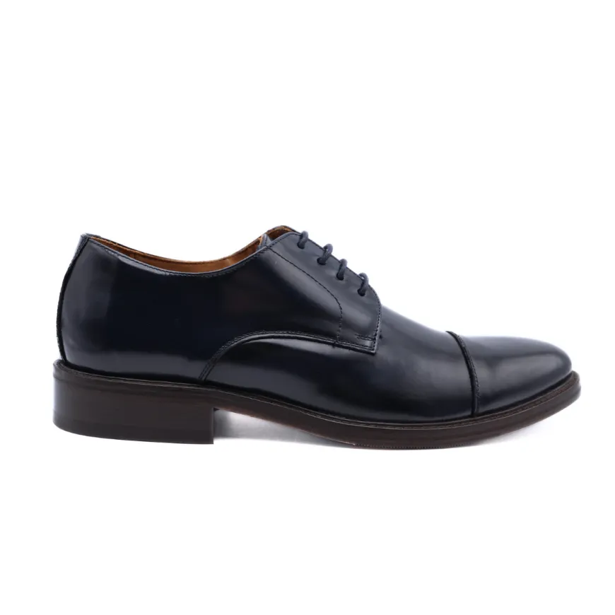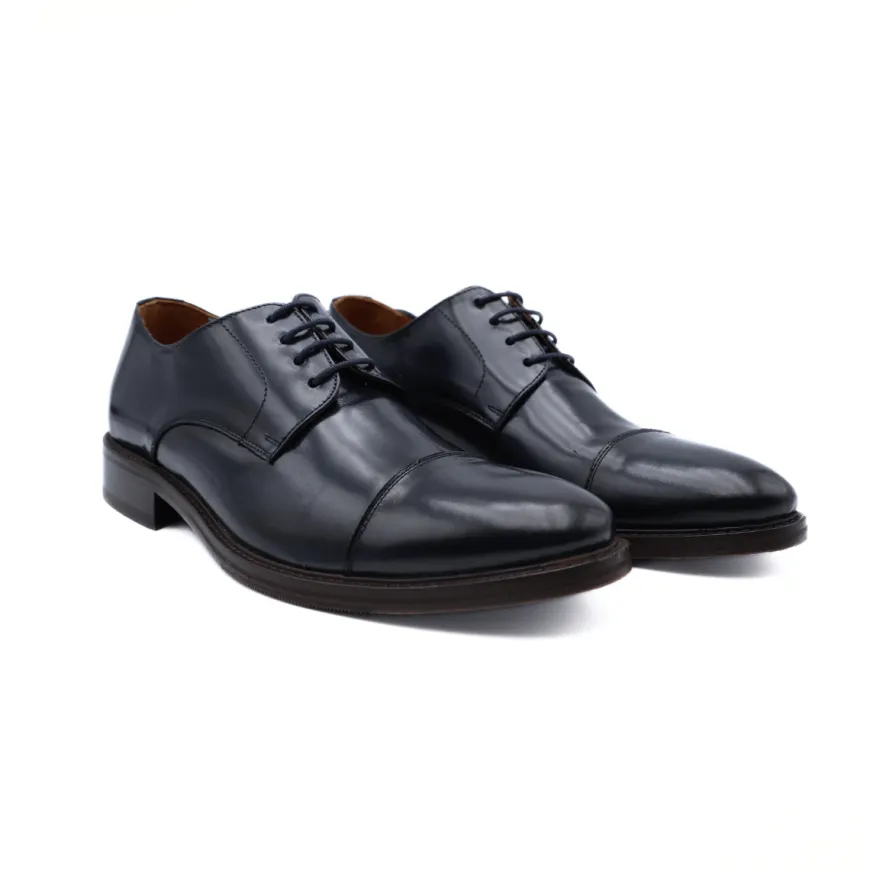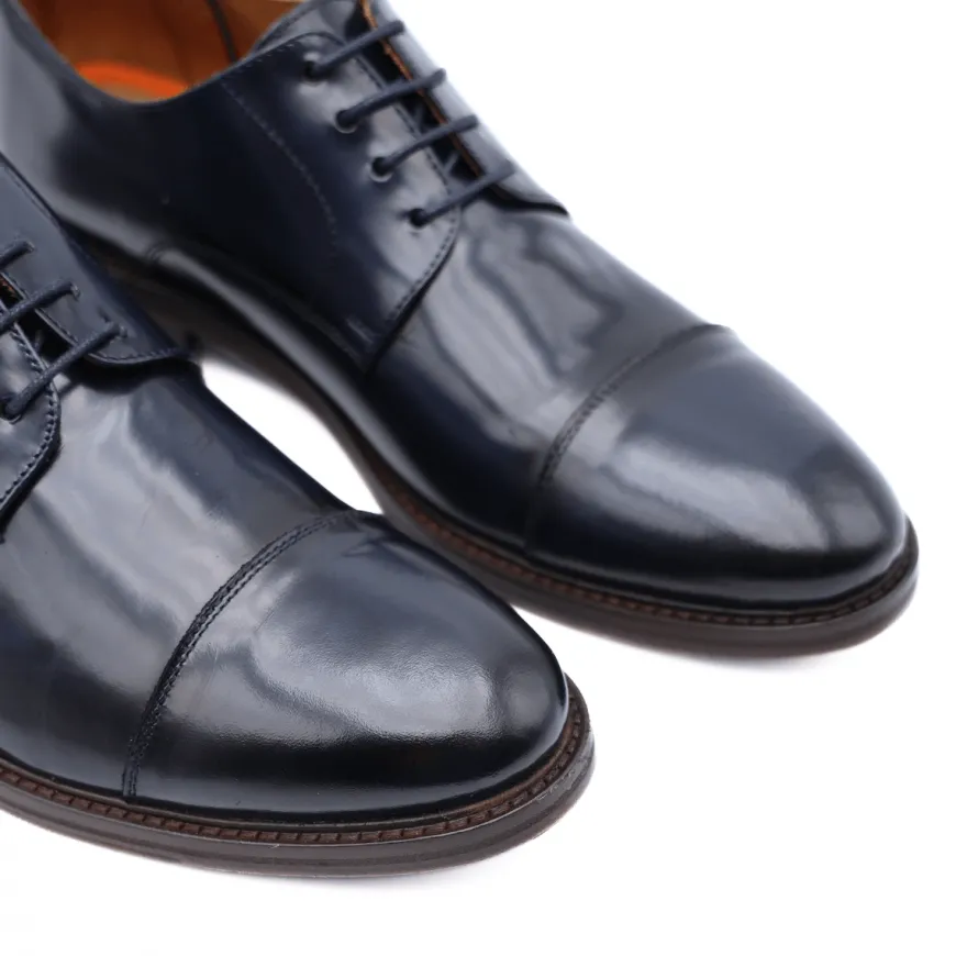 Scarpa, elegante, stringata da uomo di FRATELLI RENNELLA, modello derby. Tomaia realizzata in pelle spazzolata blu, con puntale risvoltato. Interno foderato e sottopiede in pelle. Suola in cuoio e gomma. Chiusura con laccio fino.